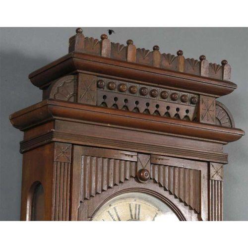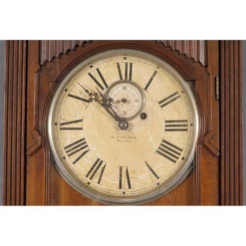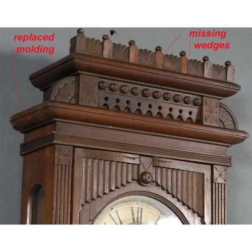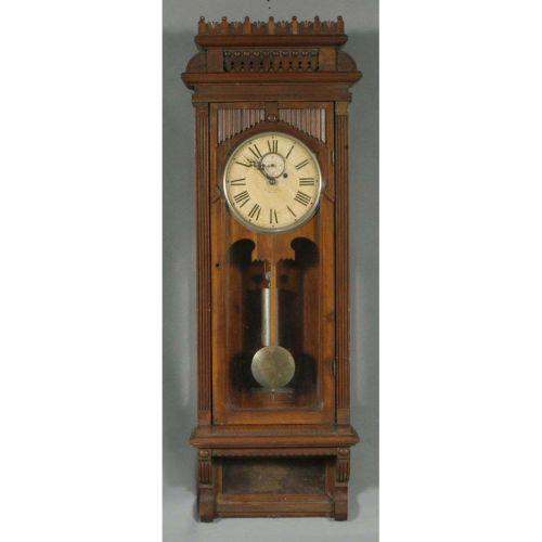 GILBERT #10 CHERRYWOOD REGULATOR 53" high, single weight with nickle plated bezel and weight late 19th century, CONDITION REPORT: generally very good original, molding return at cornice replaced neatly, small moldings at top of door have a bit of warp, lacking two applied wedges on crest, face with moderate wear to original as seen in images