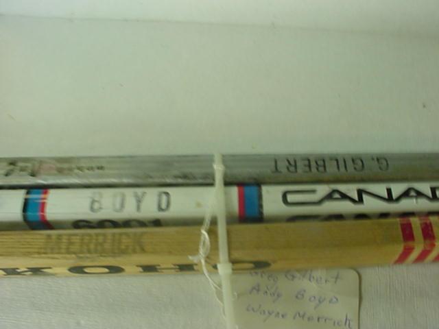 GILBERT, BOYD & MERRICK 3 Game Use Hockey Sticks: New York Islanders Players on Stanley Cup Championship Teams of 1980-1983. Marked Greg "GILBER" Andy "BOYD", and Wayne "MERRICK" (50-100)