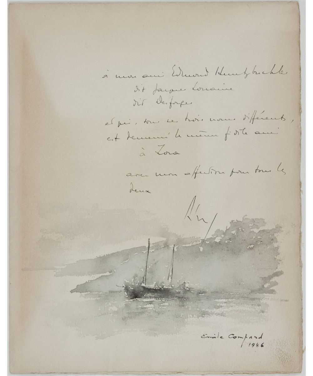 (1904 - 1984) French Resistance fighter, known during the war as "Colonel Rémy" . He is one of the most famous secret agents of occupied France during the World War II, and was known under various pseudonyms such as Raymond, Jean-Luc, Morin, Watteau, Roulier, Beauce and Rémy. Rare signed book, his Memoirs of a Secret Agent of the Free French, (Paris: Raoul Solar), 1946, in French. 194pp. soft-bound, uncut, illustrated by EMILE COMPARD (1900-1977). The front flyleaf bears a lengthy inscription signed by the author as "Remy", and also bears an original ink-wash illustration similar to the cover illustration, painted and signed by the artist Compard. Near fine.