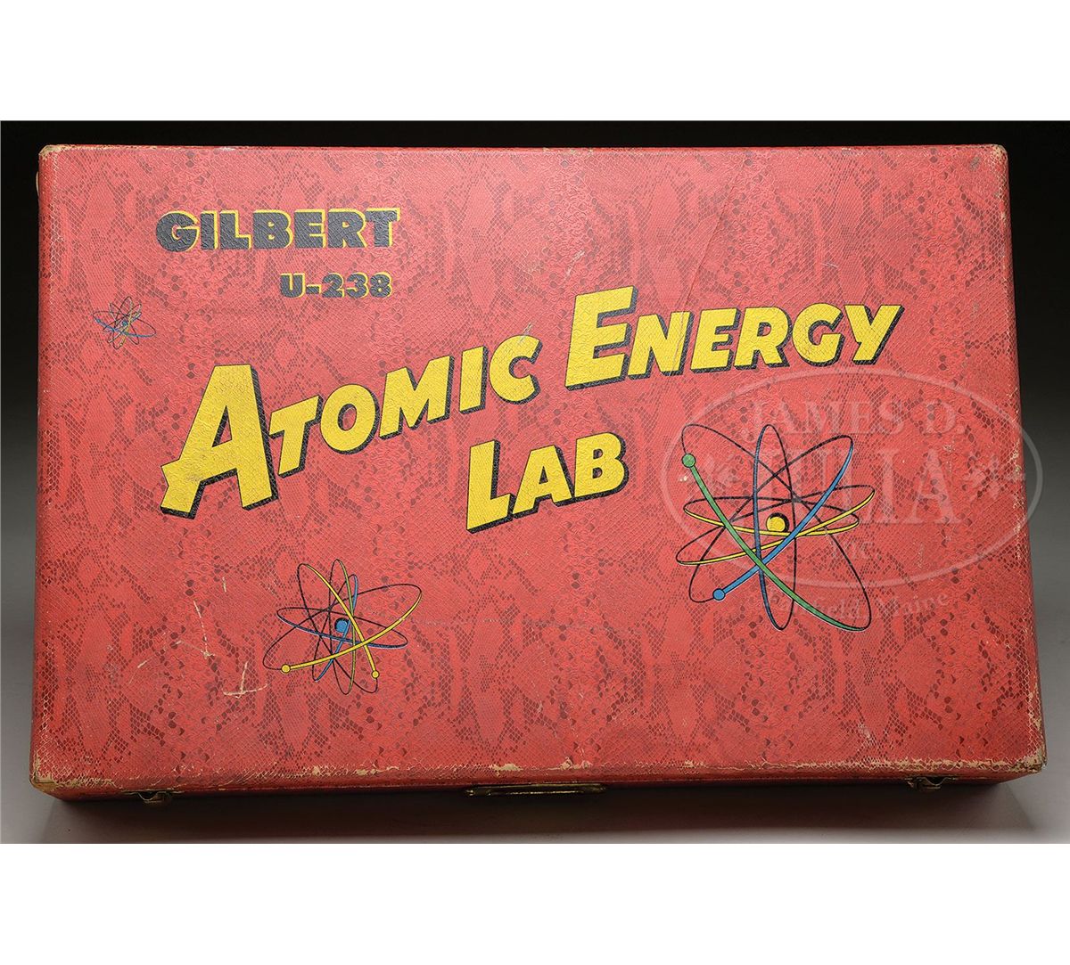 Described by A.C. Gilbert as "The most spectacular of our new educational toys...The Atomic Energy Lab was also the most thoroughly scientific toy we had ever produced, and only boys with a great deal of education could understand it." This is one of the most sought after "science" toys which rarely are offered for sale, and usually in poor condition. Due to its complexity, it was sold to the public in 1951 for $49.50 (Nearly $500 in today's dollars!). At the time the U.S. Government was offering a $10,000 reward to anyone who discovered a deposit of Uranium ore. One could imagine a young boy opening this present at Christmas and staring at the items within like the cloud chamber, the deionizer, glass bottles with labels like "carnotite", "uraninite", etc. With a very strange and eerie appearance, this unit appears to be complete and intact. Obviously a toy of this nature would appeal to those who like space toys, science toys, etc. The inside lid of the box features full color graphics of a boy wide eyed looking with great anticipation while conducting a scientific experiment with the cloud chamber. SIZE: 25" l x 16-1/2" w x 5" d. CONDITION: Overall very good to near excellent with only minor edge wear to box. Interior appears to be complete and intact. Rubber hoses present but showing expected deterioration. 1-13204
