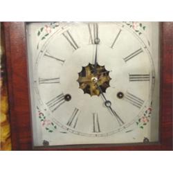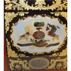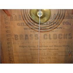 GILBERT WALNUT MANTEL CLOCK. Marked with label on inside "Gilbert Manufacturing Company-Winstead, Conn.-8 day, 30 hour" clock. Reverse painted decoration on glass on bottom door. 25" H, 15.25" W, 4.5" D