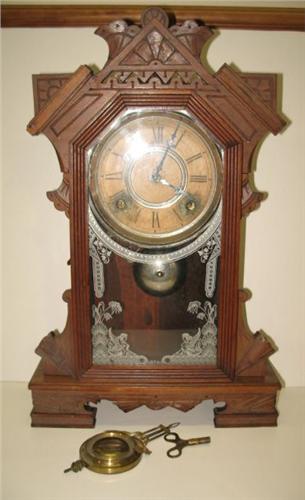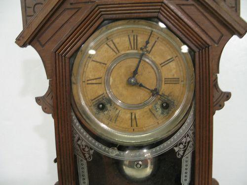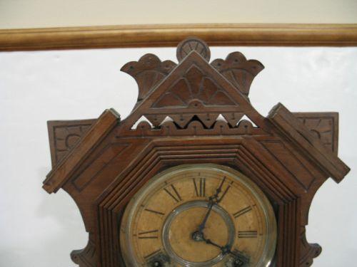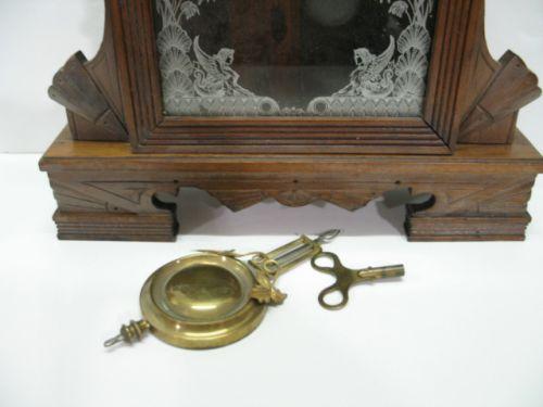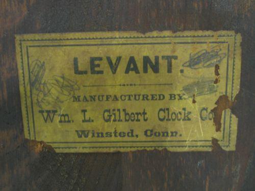 GILBERT WALNUT MANTEL CLOCK. Marked with label on reverse “Levant, Manufactured by Wm. L. Gilvert Clock Co., Winsted, Conn.” Shows excessive wear to clock face. Has pendulum & key. 19.25” H, 12” W