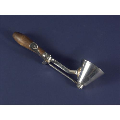 A vintage Gilchrist N#33 brass and nickel ice cream scoop, cone shaped scoop, N#10 interior scoop wiper blade, 10'' long, scoop diameter 2.5'', wear to nickel with brass showing through on back of scoop.