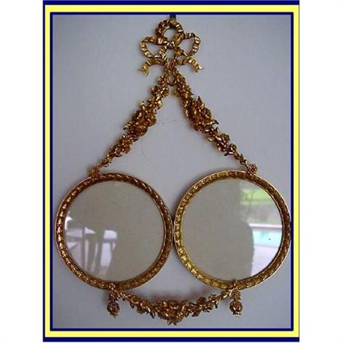 Exceptional gilt bronze hanging double picture frame. Made France, 19th century. <BR>Length is 9 3/4inches. 7 5/8inches wide.<BR>A loop behind an elaborate ribbon in richest gold bronze, suspends a pair of floral swags of exquisite delicacy and detail and the highest level of workmanship. In turn, a pair of chrysanthemums at the bottom holds a pair of round frames. Each has raised repousse foliage. <BR>Another garland of exceptionally made flowers finishes off the piece.<BR>The gold is rich and in mint condition. The flowers are minutely detailed and in equally wonderful condition.
