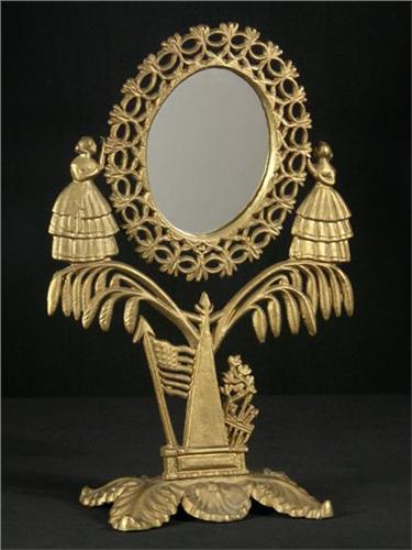 TABLE TOP CHEVAL MIRROR: Cast metal gilt tone colonial motif table top cheval mirror. The piece features a leaf form base, an obelisk shaped pedestal splitting into two branches with two colonial dressed women supporting the framed mirror. Measures 20''H with a 7'' x 5'' oval mirror.