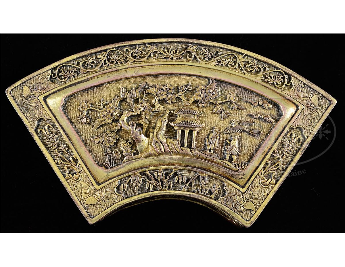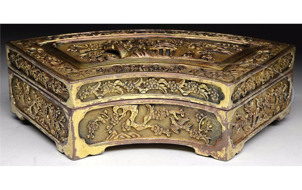 20th century, China. Fan-shaped box carved in chaste of figures in a garden with a pavilion having floral and bamboo borders, all on a punch rose ground. Chih Lung mark on the base. Accompanied by box. SIZE: 6-1/2" l x 3" w x 1-3/4" t. PROVENANCE: The Estates of John Gerhardt Family Trust. CONDITION: Rubbing to the gilt. 9-25042