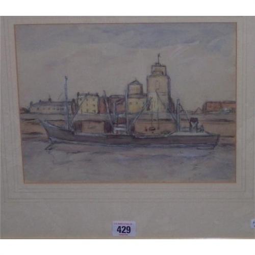 GILT FRAMED WATER COLOUR "CARGO BOAT AT DOCKSIDE" BY WILLIAM TIMMINS