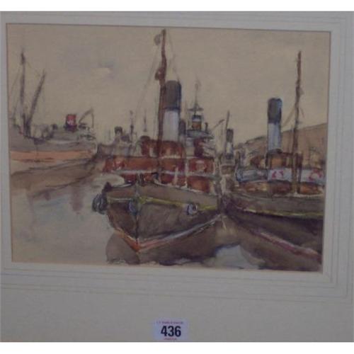 GILT FRAMED WATER COLOUR "TUGS AND CARGOBOATS MOORED AT DOCKSIDE" BY WILLIAM TIMMINS