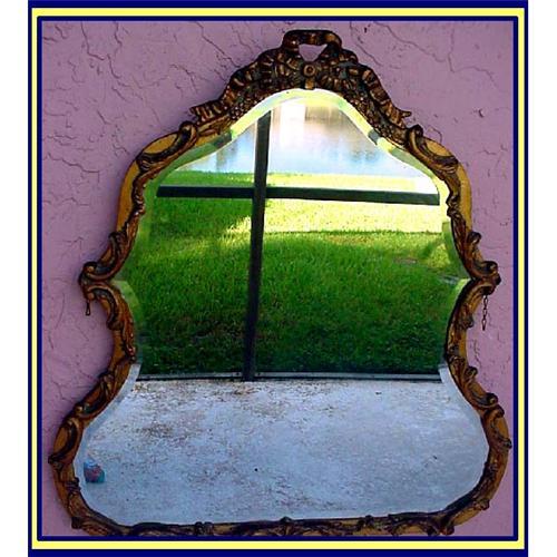 Gilt gesso frame wall mirror. European Continental 19th century. Suitable for hanging above a pier / console table.<BR>Measures 33inches high.<BR>Rococco scrolling shaped gilt wood frame with befelled glass. Top has bow, ribbons and flowers in high relief. Sides consist of a series of foliate scrolls cut very deep. <BR>Chain at the back for hanging.<BR>Condition is very good. The mirror has no dark spots/damage of any sort. Very light surface scratches on the frame as to be expected in a piece of this age, in no way detract. Original condition - no restorations.