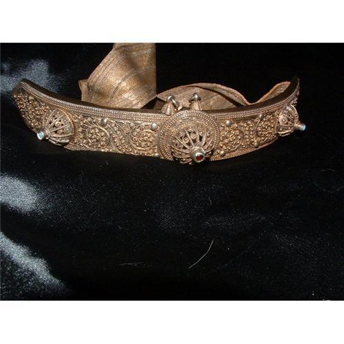 We are offering an old Russian Cossack Belt, made of what seems to be silver gilt with two turquoises and a rubby set in the three boses of the belt. The rest is of cloth of gold. This can also be lengthened slightly by moving the attachments to the rear.