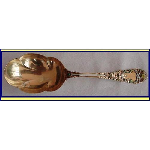Exceptional gold on silver serving spoon with enamel and repousse mask decoration. American, 19th century, Dominick & Haff in the Renaissance 1894 pattern.<BR>Measures just under 8inches long and weighs 2.5oz.<BR>Richly gilded silver (gilding for acidity of fruit). Large scalloped bowl, arching handle, widening twoards the fan shaped end. Scrolling foliage surrounds a wonderful mask head - possibly taken from Ancient Greece mythology. A larger version of the bearded mask is on the back of the spoon, behind the bowl. The foliage is enriched with turquoise, yellow and green enameling. Back of spoon has mark of Dominick and Haff and raised letters Pat-D.94<BR>Condition is excellent.<BR>Thanks for help to Liebdora