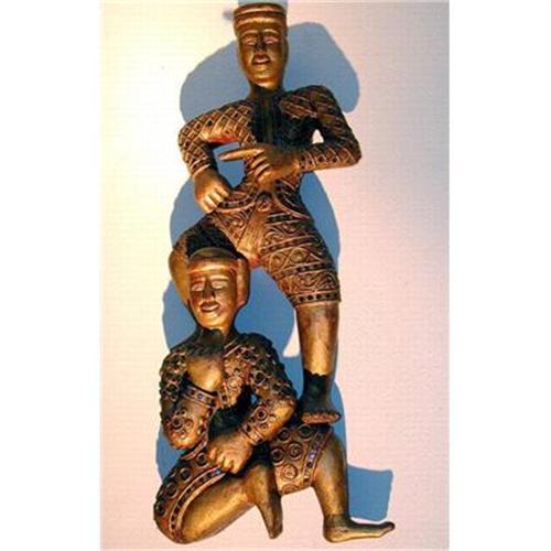 A DECORATIVE GILT WOOD SCULPTURE OF TWO ACROBATS<P>One acrobat stands on the shoulders of the other in this highly unusual piece of decorative wall sculpture from Burma (or possibly Thailand), and points to his right, while the other supports him on a shoulder and knee. They have quite a bit of character in their act. Their costumes are decorated with bits of colored mica or glass flakes. <p>The two figures are carved from a single piece of wood which is gilded over a red lacquer underlayer, and the composition is quite an interesting and unusual one, especially for a wall piece. The height is over two feet (26") by 12" wide, and the depth from the wall to the pointing finger is about 5.75". Condition is excellent, and this piece was likely made sometime in the 20th century.