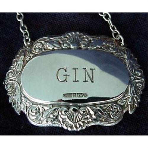 Sterling silver decanter / bottle label for Gin. Made Birmingham, England, 1997. Highly ornate frame with repousse shells, flowers and leaves. Hangs from silver chain. Hallmarks on front: Maker: CR&S, anchor, lion, date mark 'X'. Very good condition.