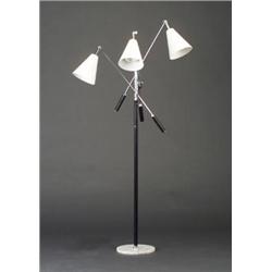 GINO SARFATTI for ARTELUCE Triennale floor lamp with three adjustable arms ending in leather-covered handles, conical white enameled shades, and black enameled shaft on circular white marble base. Marked "Made in Italy." Approx. 56 1/2" x 34 1/2" $800 - 1,200