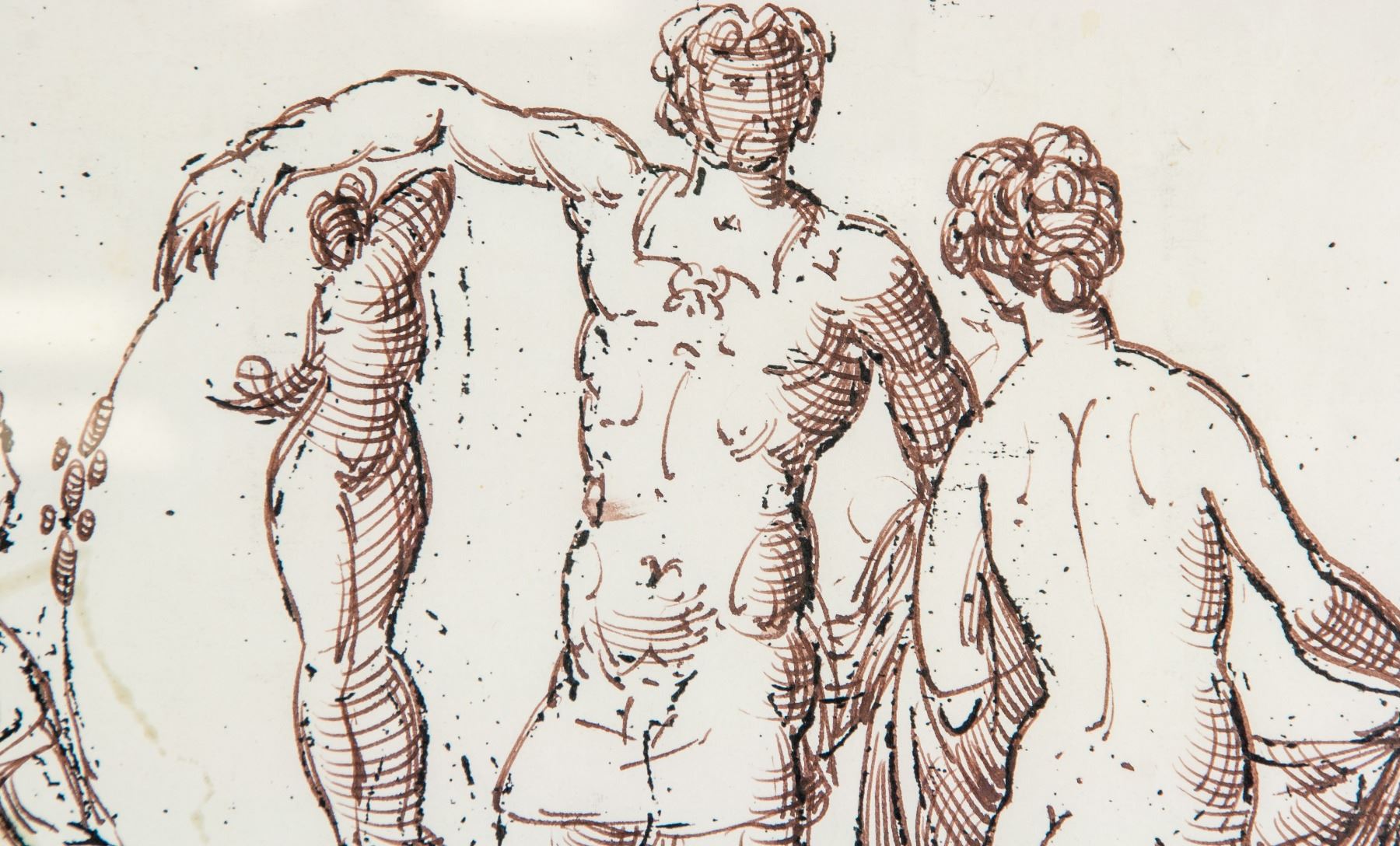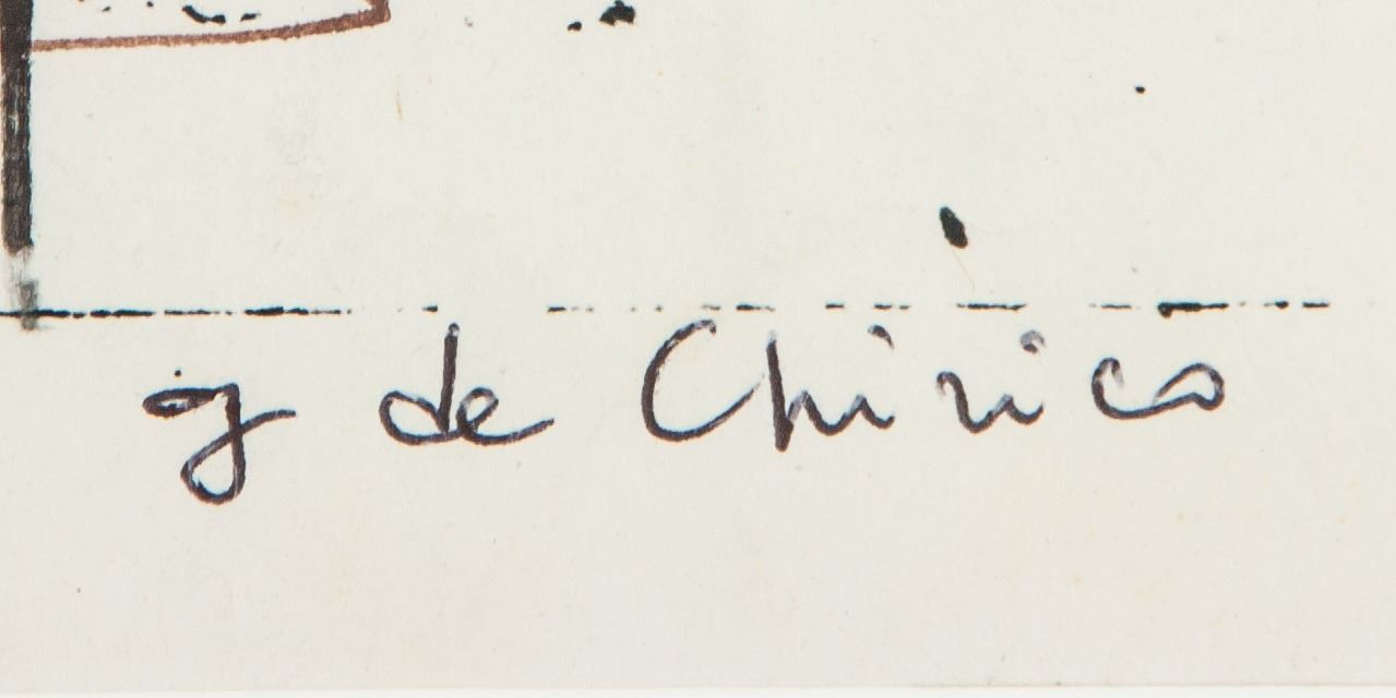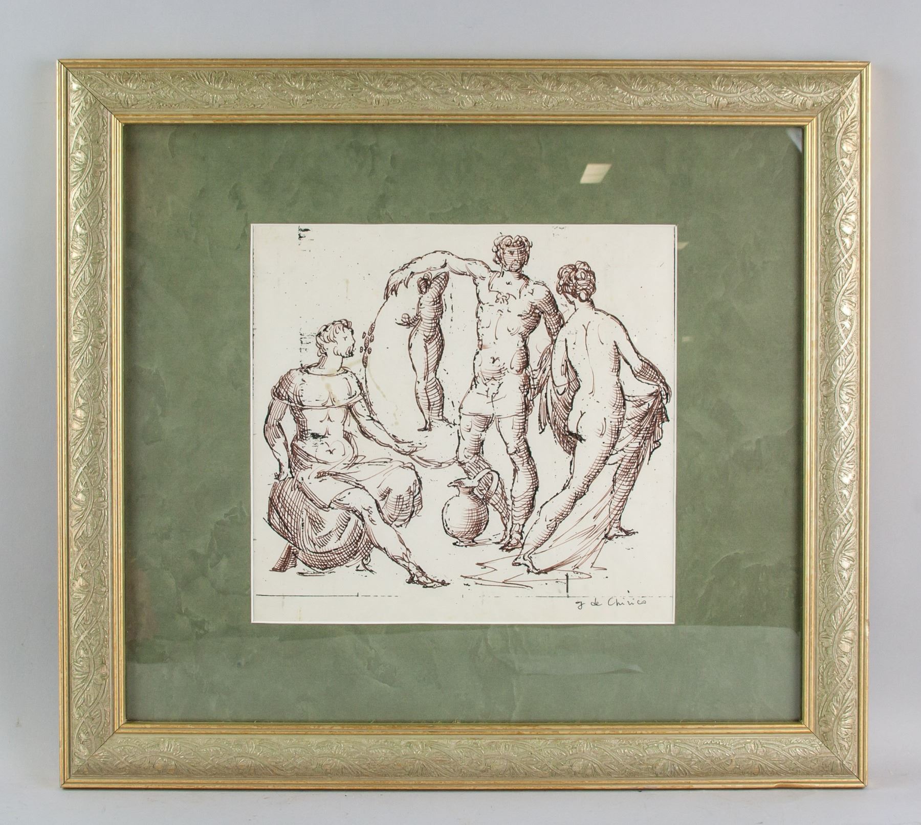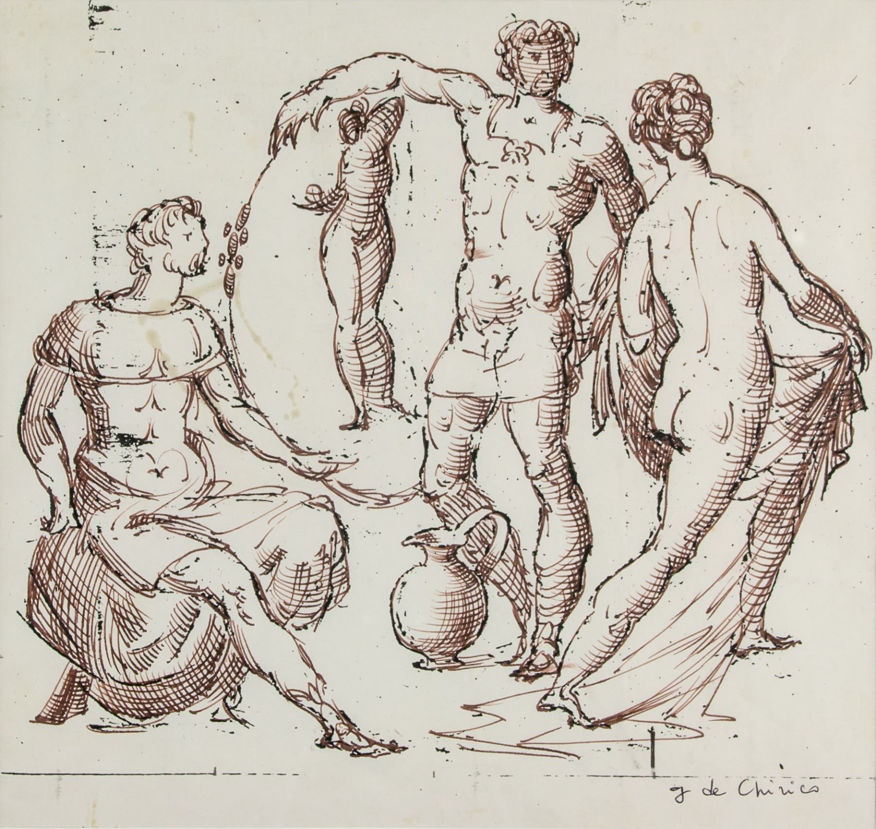 Ink on paper sketch. Featuring nude figures. Signed and attr. Giorgio de Chirico (Italian, 1888-1978). 9.6 x 10.5 in. (24.5 x 26 cm). Giorgio de Chirico was an Italian artist known for his depictions of dreamlike town squares and still lifes. “To become truly immortal a work of art must escape all human limits: logic and common sense will only interfere,” he once mused. “But once these barriers are broken it will enter the regions of childhood vision and dream.” Born on July 10, 1888, in Volos, Greece to Italian parents, the artist went on to study at the High School of Fine Arts in Athens before attending the Academy of Fine Arts in Munich in 1906. While in Germany, he developed in an interest in the mythological subject matter of Symbolist painters like Arnold Böcklin. Moving to Florence after finishing school, he began producing some of his hallmark works, among them, Enigma of an Afternoon (1910), Mystery and Melancholy of a Street (1914), and The Song of Love (1914). In 1917, he introduced his ideas surrounding what he called Metaphysical painting into writing, helped by his friend Carlo Carrà. Shortly thereafter—though he had gained success and influenced René Magritte and André Breton—he renounced not only Metaphysical and Surrealist painting but all of Modern art, in an article The Return of Craftsmanship (1919). Revisiting traditional iconography and techniques found in Neoclassical and Baroque paintings, the works he produced elicited disappoint in many critics of the time who failed to see the artist’s vision. Throughout the rest of his life he often made copies of his earlier Metaphysical works to profit on their popularity. De Chirico died in Rome, Italy on November 20, 1978. Today, his works are held in the collections of The Museum of Modern Art in New York, the Tate Gallery in London, the Peggy Guggenheim Collection in Venice, and the Art Institute of Chicago, among others. PROVENANCE: Southern Ontario estate