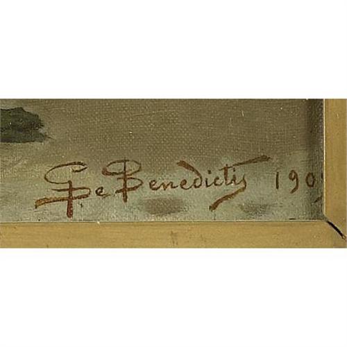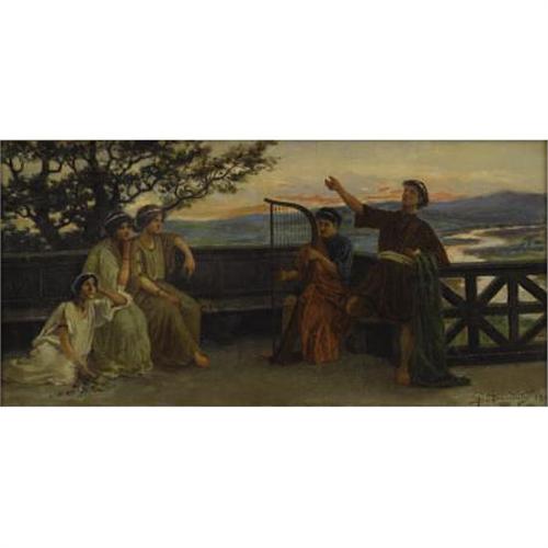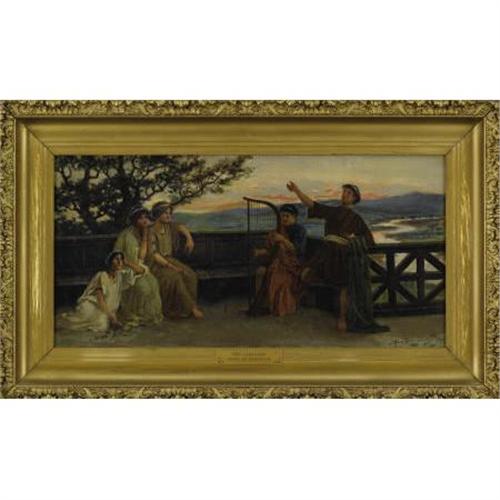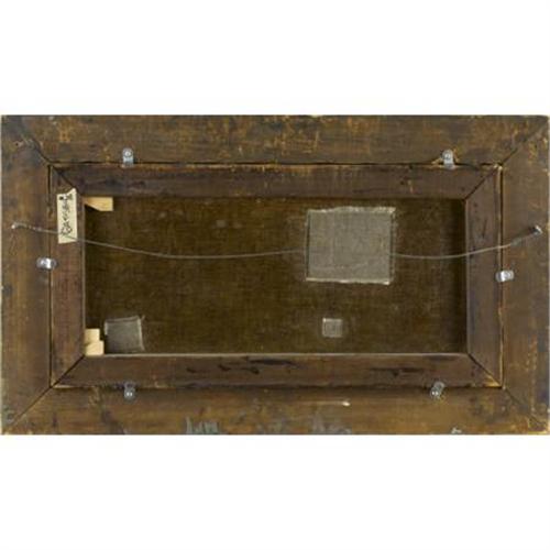 <B>Giosue de Benedictis (Italian/American, 1874-1958)<BR></B></I><I>The Serenade</B></I>, Circa 1909<BR>Oil on canvas<BR>12 x 24 inches (30.5 x 61.0 cm)<BR>Signed at lower right <I>G de Benedictis <BR></B></I> <B></B></I> <B>Condition Report:</B> Canvas has been wax lined, 4 inch square patch upper left and two smaller patches lower left and lower right, 3 inch diameter D-shaped tear center left inpainted, large area of overpaint upper right corner, small tear inpainted in lower area of singer right.<BR><BR><b>Shipping:</b> Framed - without Glass, Medium (<a target="_blank" href="http://www.heritageauctions.com/common/shipping.php">view shipping information</a>)