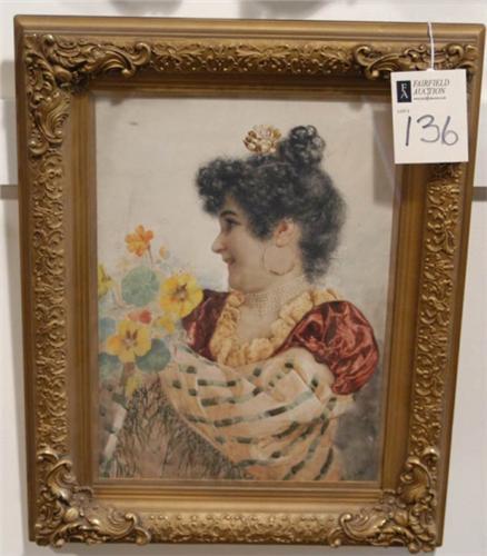 GIOVANNI FILOSI 17"x12" watercolor portrait of a beauty with flowers, circa 1890 <BR>condition: excellent