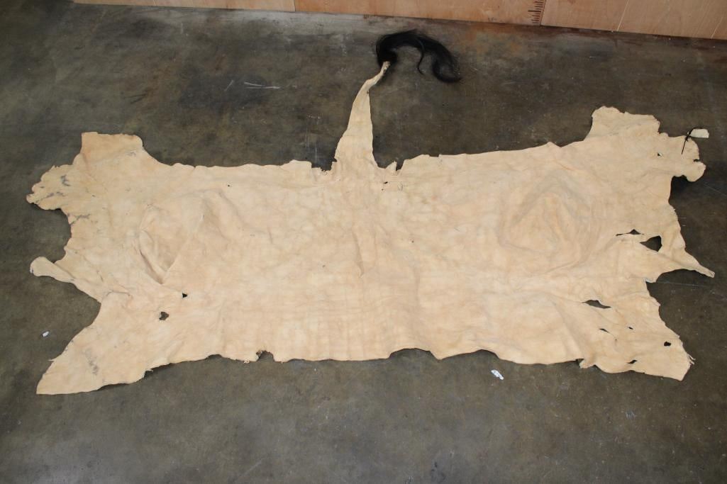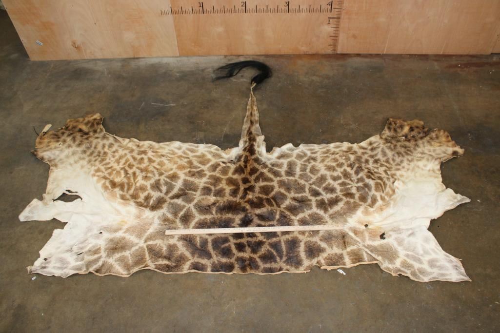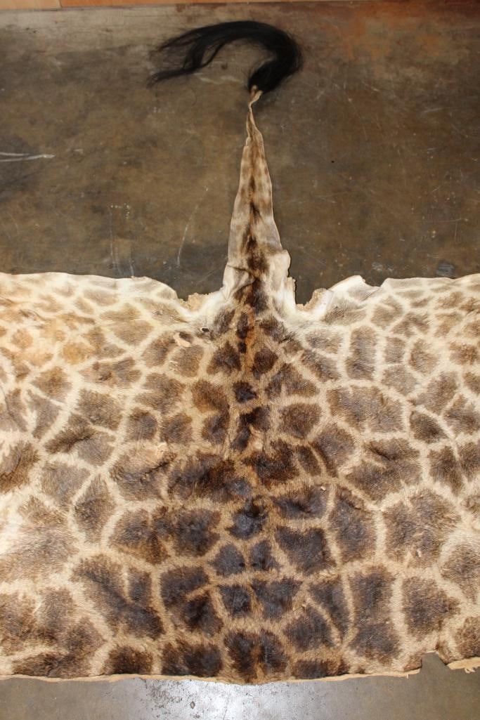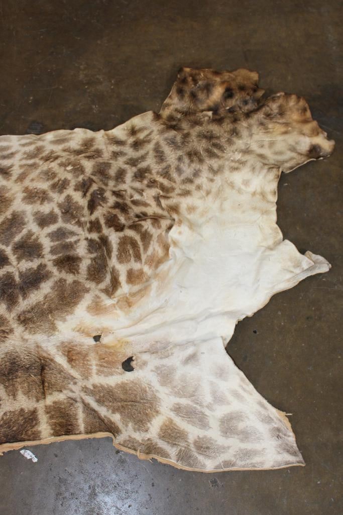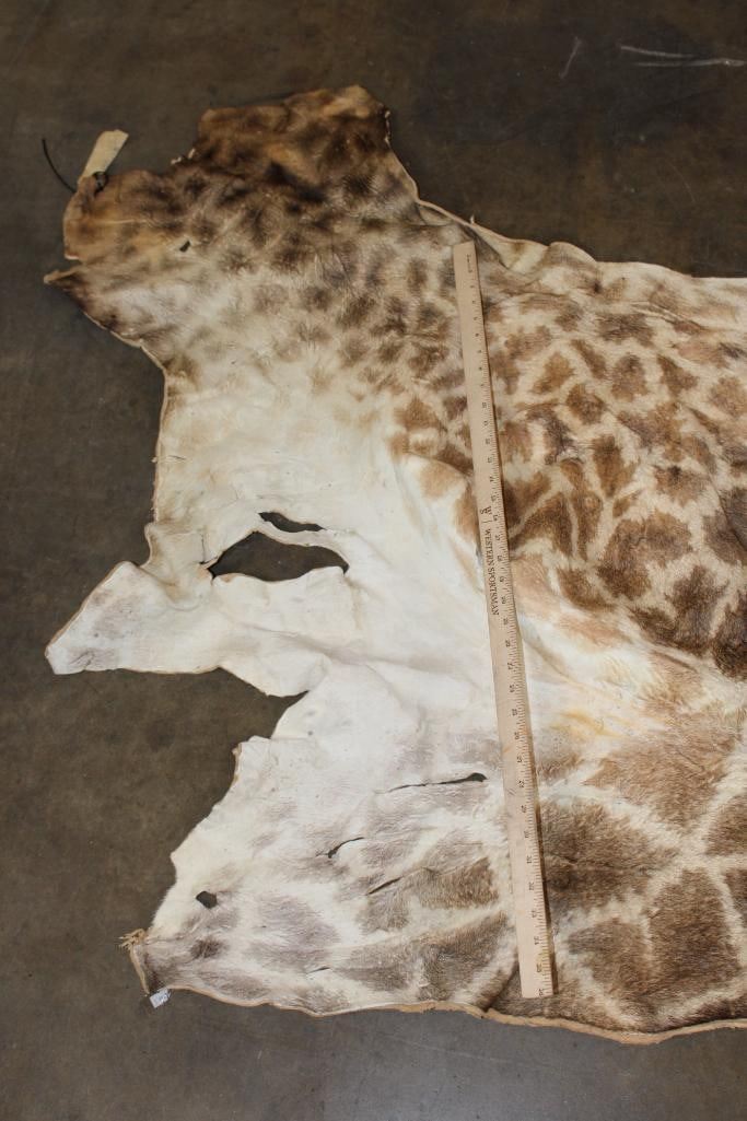 Nice and Clean GIRAFFE Back Hide. It measures 9' Long x 6' Wide. There are a few holes and splits 2nd to the tanning process, otherwise it is in Good Condition. This is the Back Hide of the Giraffe in the previous Lot. TAXIDERMY