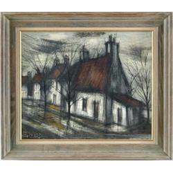 Lot # 42 GIRARD (20th Century) STREET SCENE. Oil on canvas scene shows a street with white houses and steep brown roofs with double chimneys. Stark trees are also lined along street. Signed lower left “Girard”. Also signed on back of canvas “Girard 1967”. A Buffet type scene and technique. Probably French and possibly Michel Girard. Housed in a stained deep molded wood frame with linen and gold liner. SIZE: 20” x 24”. CONDITION: Very good. 9-99245 (400-600)