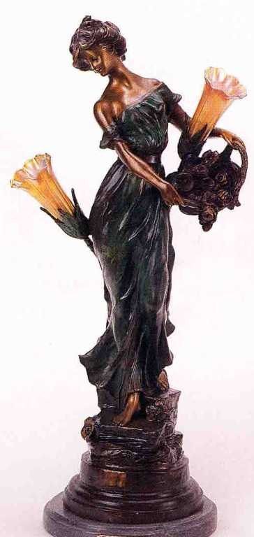 "GIRL WITH BASKET OF FLOWERS" BRONZE SCULPTURE LAMP - AFTER FLORA - BEAUTIFUL COLOR PATINA - MOUNTED ON FINE ITALIAN MARBLE BASE - SIGNED - MINT CONDITION - 32"H X 10"W - LOST WAX CAST BRONZE
