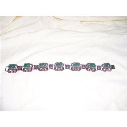 MADE BY GJ POSSIBLY ???GEORG JENSON???OF STERLING SILVER, IS 7.25 INCHES LONG. CONTAINS 7 GREEN STONES WRAPPED WITH SILVER WITH FUNCTIONING CUFF.