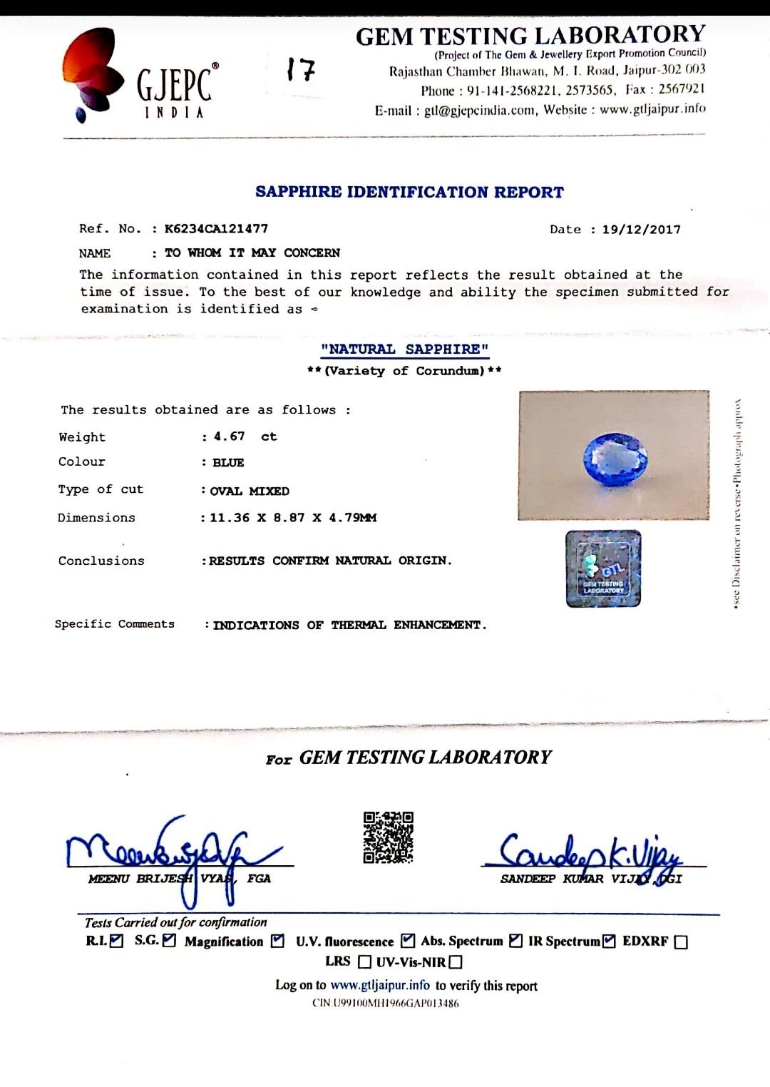 GJEPC Certified 4.67 ct. Oval Cut Loose Blue Sapphire Gemstone , Gemstone : Sapphire , Shape : Oval , Color : Blue , Size: 11.36 x 8.87 x 4.79 MM , Weight : 4.67 Ct. , Country of Origin : Sri Lanka (Cylon) , Conclusions : Results Confirm Natural Origin , Certification : GJEPC.