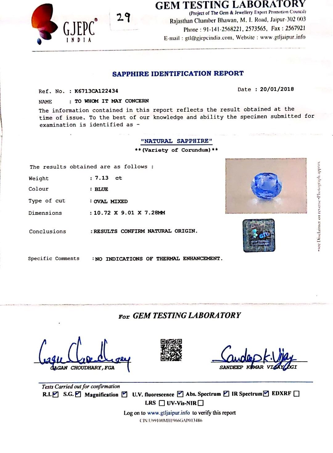 GJEPC Certified 7.13 ct. Oval Cut Loose Blue Sapphire Gemstone , Gemstone : Sapphire , Shape : Oval , Color : Blue , Size: 10.72 x 9.01 x 7.28 MM , Weight : 7.13 Ct. , Country of Origin : Sri Lanka (Cylon) , Conclusions : Results Confirm Natural Origin , Certification : GJEPC.