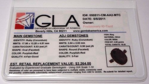 Comes with GLA Preliminary ID Card (Gemological Laboratory of America, Beverly Hills, Ca 90211) stating Est. retail replacement value: $2,264.00