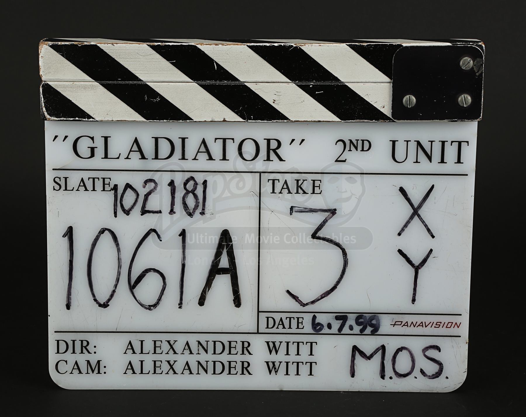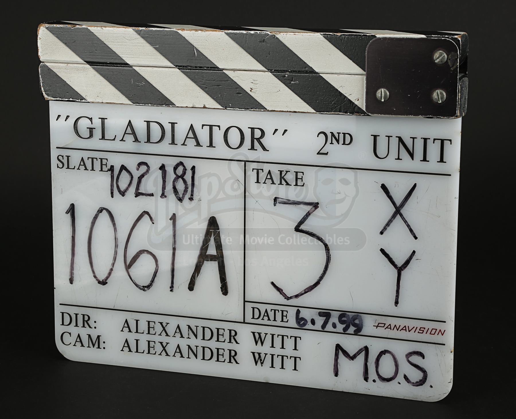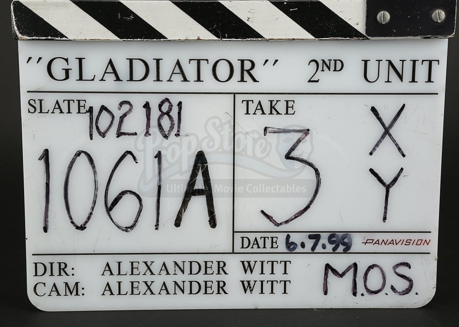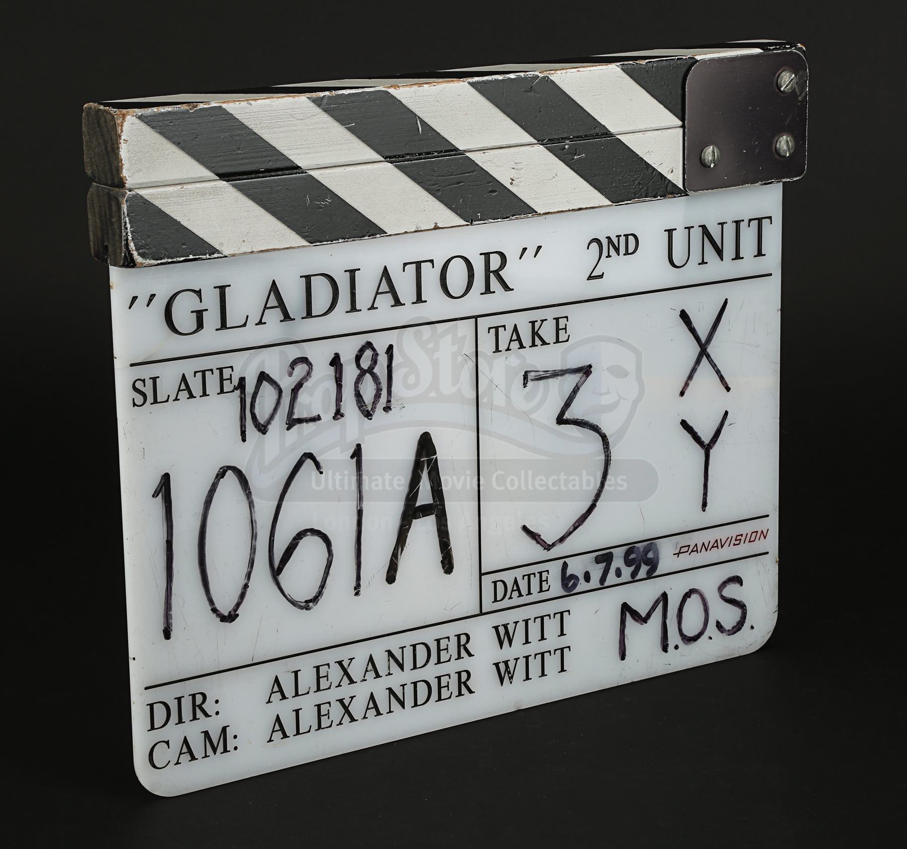Used by the 2nd Unit film crew, the piece displays the production title “Gladiator”, the name of the Unit Director and Director of Photography Alexander Witt, all engraved in black. Several fields on the piece have been filled in with black ink, including the date “6.7.99”, slate “102181 – 1061A” and take “3XY”. The clapper displays wear from production use, including minor scuffs to the paintwork on the clapper arm and light surface scratches on the acrylic. Dimensions: 3 cm x 28 cm x 23.5 cm (1 ¼” x 11” x 9 ¼”)