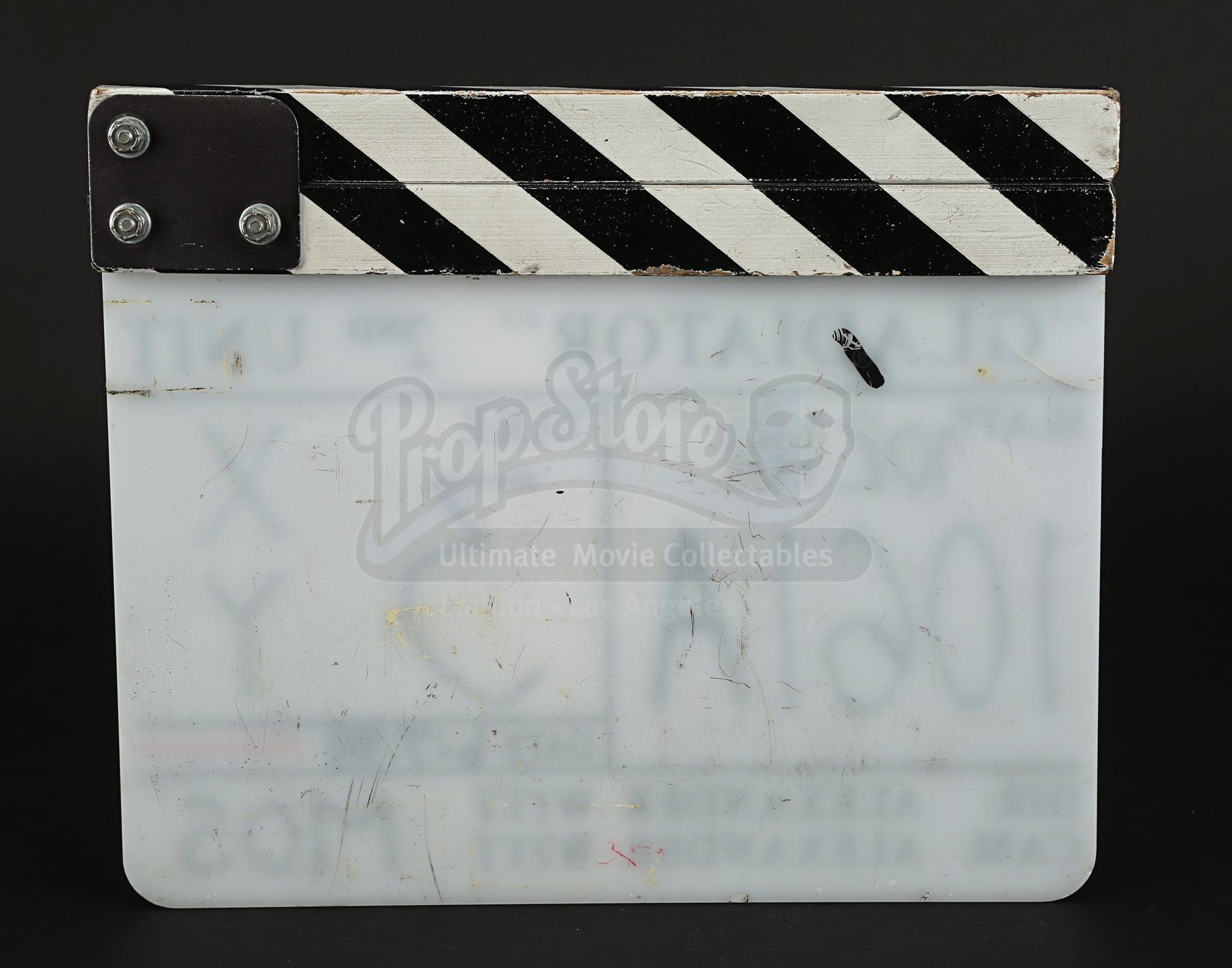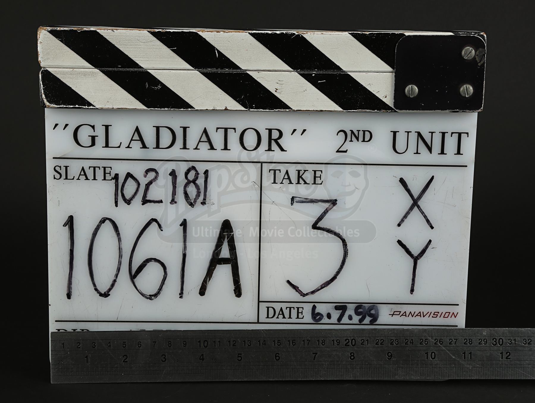 A 2nd Unit clapperboard from Ridley Scott’s Oscar®-winning historical epic Gladiator. The clapperboard consists of an acrylic slate with wooden clapper sticks fixed on the top.