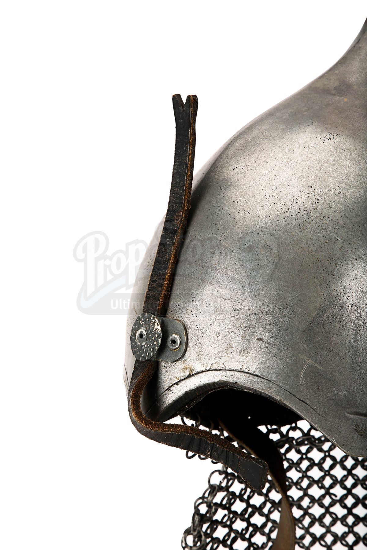 Made from fibreglass, the helmet is impregnated with aluminium filings to replicate a metal finish, with a resin spike on top, a metal chain-mail neck protector and a leather tab across the nose. Lined with black fabric and foam for comfort, the helmet displays two leather straps that fasten under the chin. The lining displays damage and marks from production use and age, and minor scratches are present on the fibreglass and leather work. Dimensions: 25 cm x 19 cm x 63 cm (9 ¾” x 7 ½” x 24 ¾”)