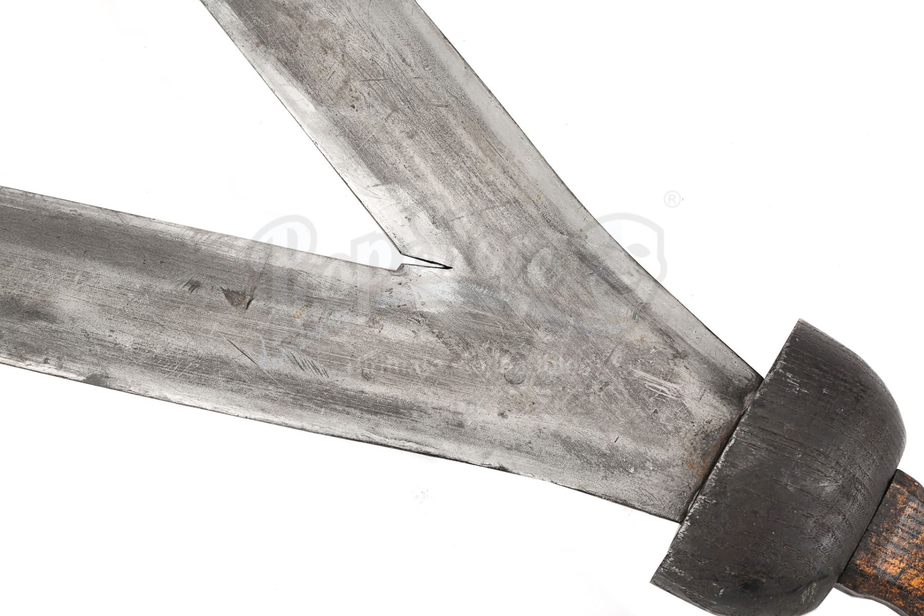 The sword is a stunt version and features a black-painted wooden handle and rubber blades with a metal armature. The blades are painted silver to mimic steel and have been intentionally distressed to look battle-used. The piece has some wear from production use and age. The rubber has split near the point where the two blades diverge. There is a small amount of paint transfer on the blade and the paint has worn off on parts of the handle. Dimensions: 75 cm x 33 cm x 8 cm (29 1/2" x 13" x 3 1/4")