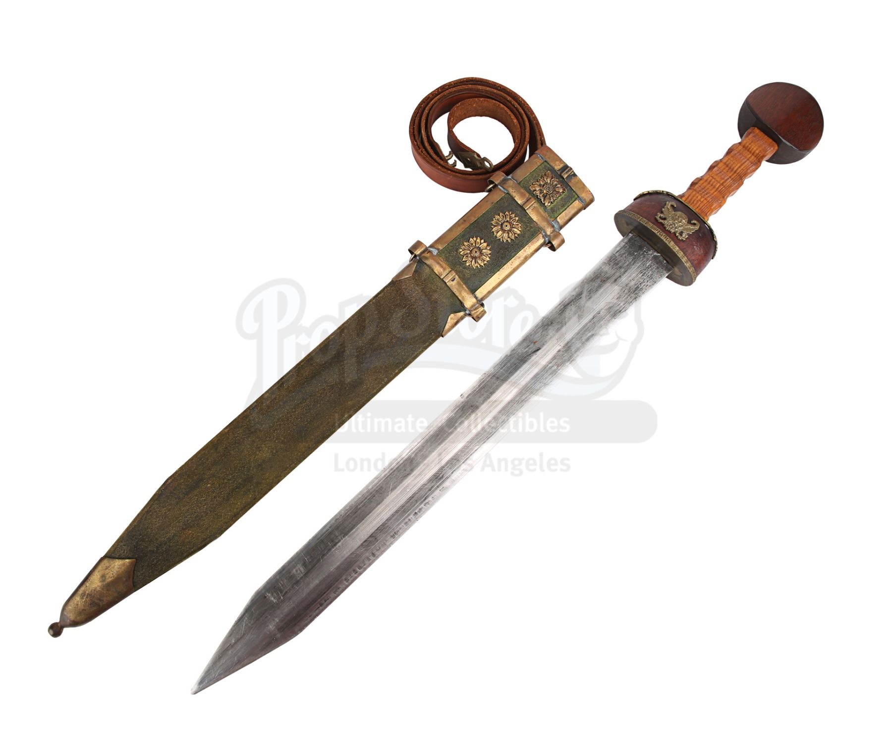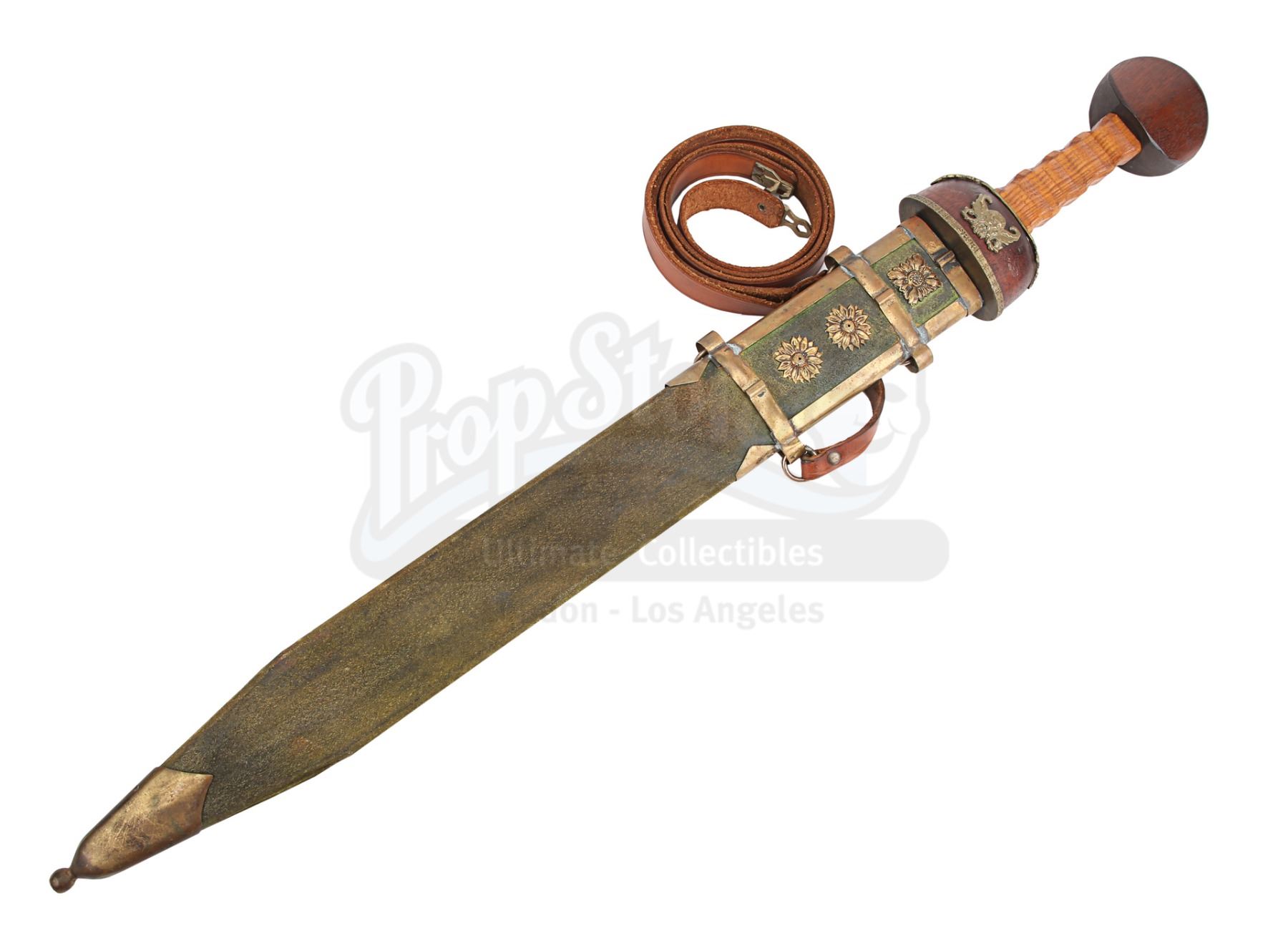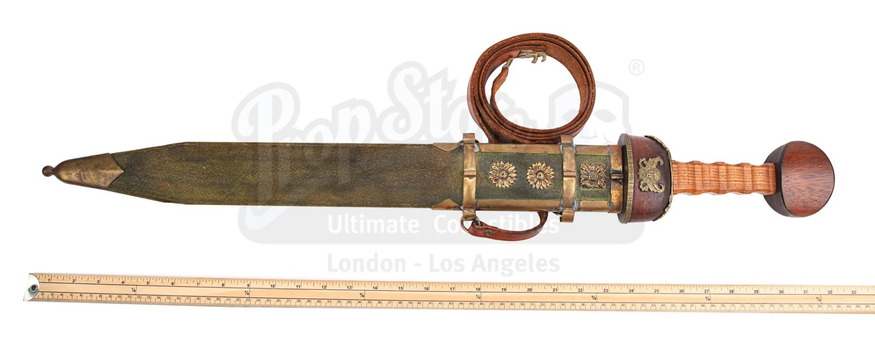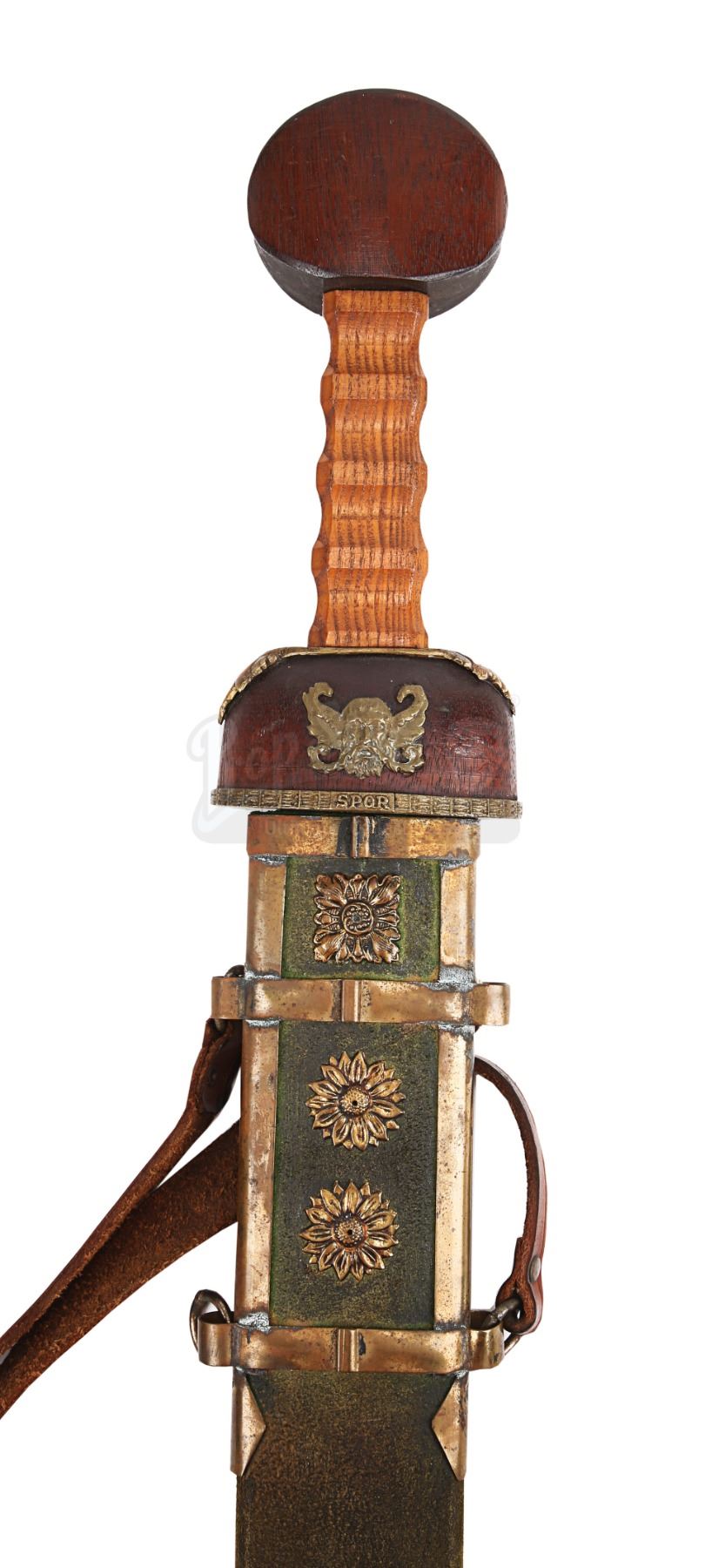 A hero officer’s sword and scabbard from Ridley Scott’s historical epic Gladiator. Officers wore their swords on their hips during the opening battle against the Barbarian tribes in the forests of Germania.