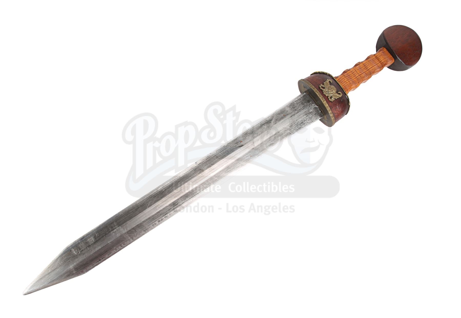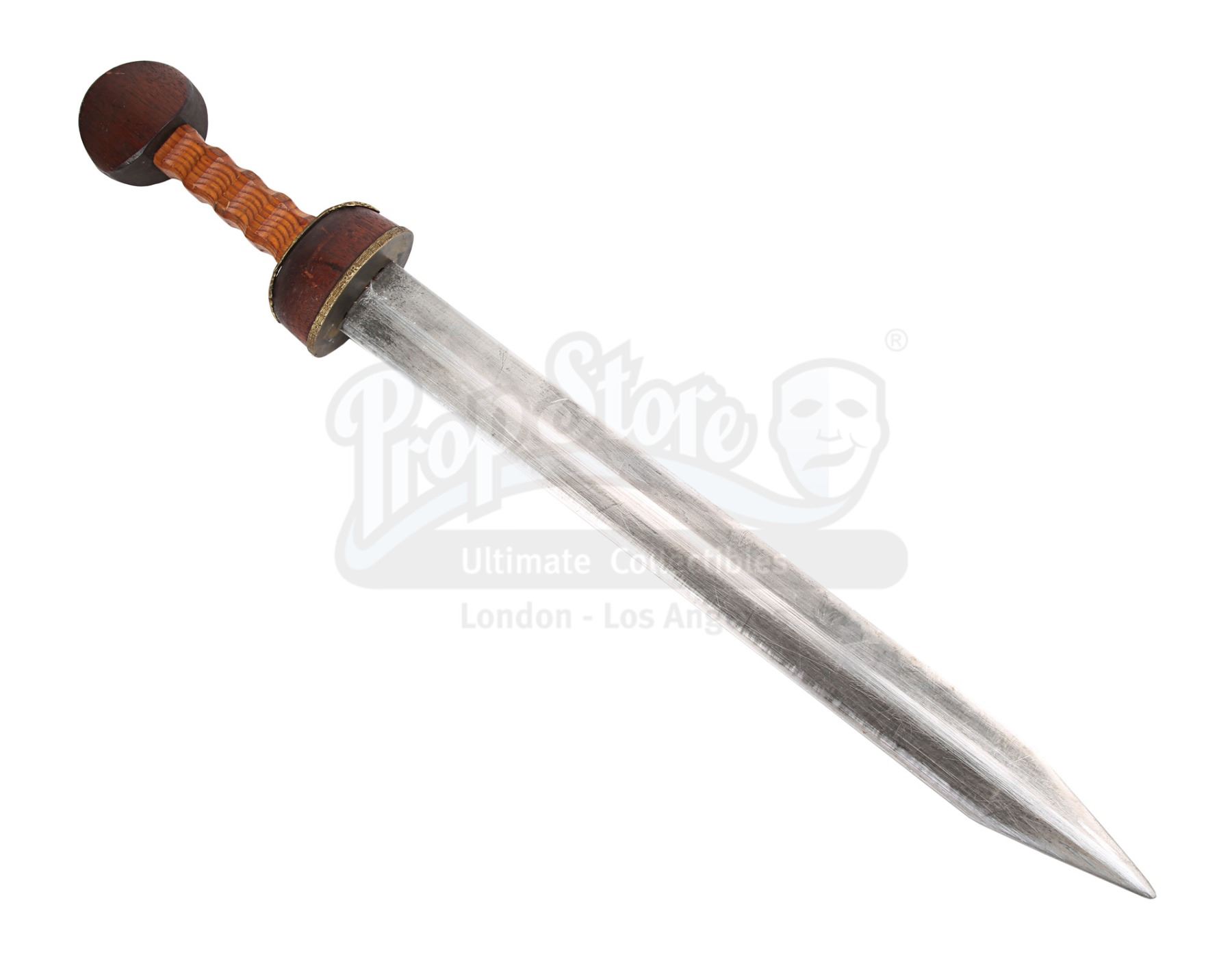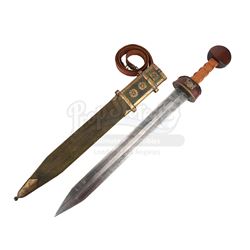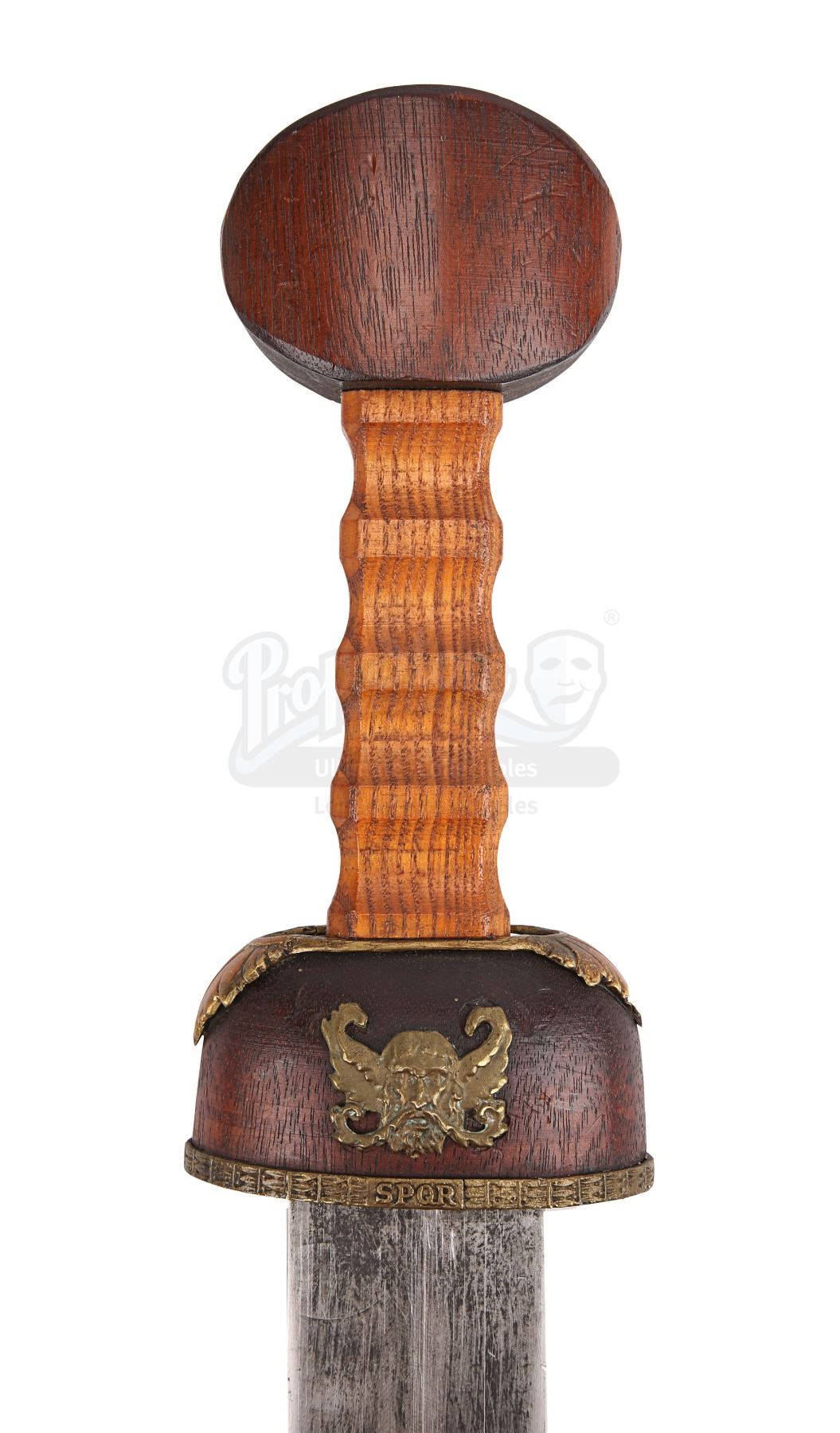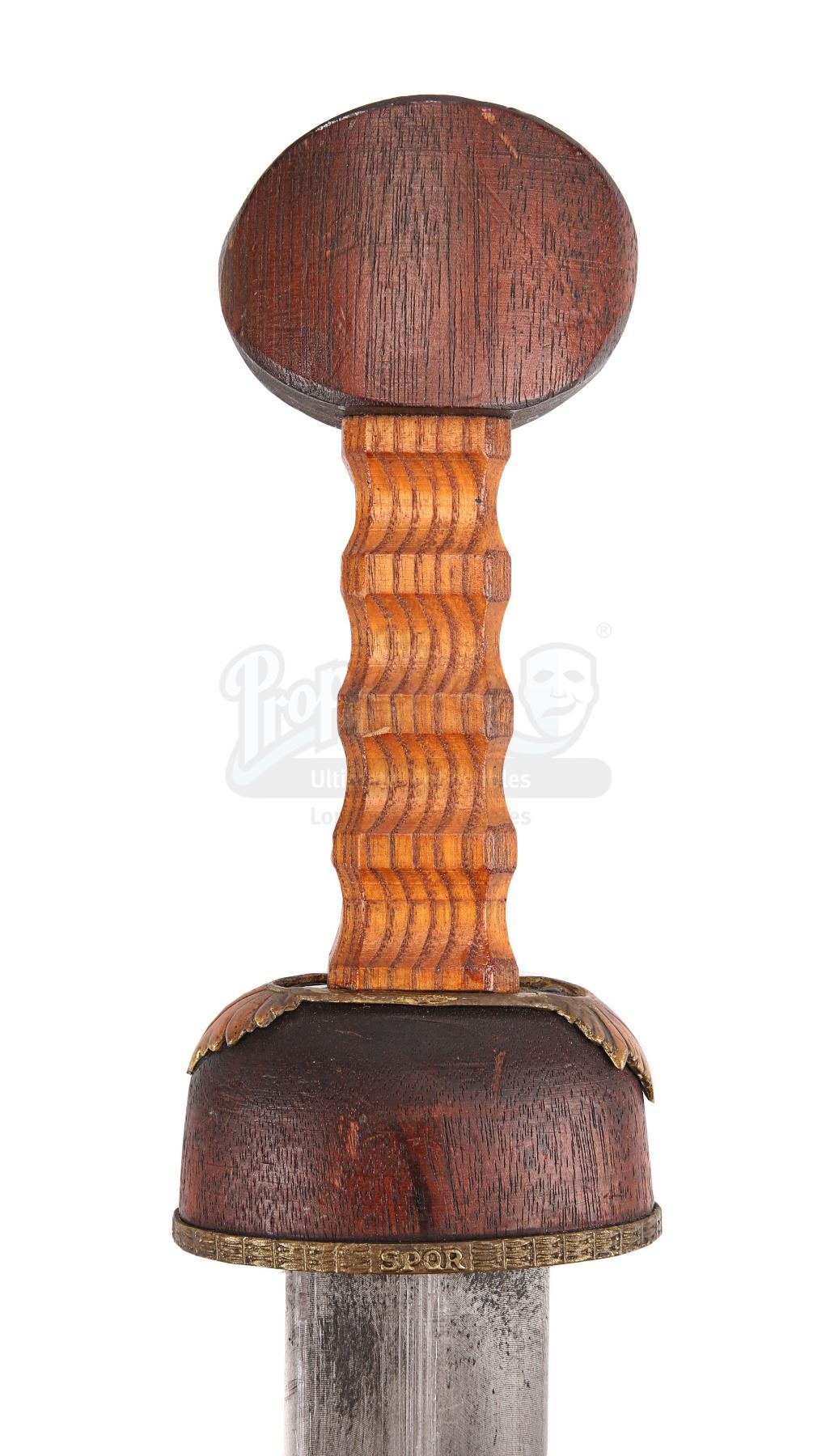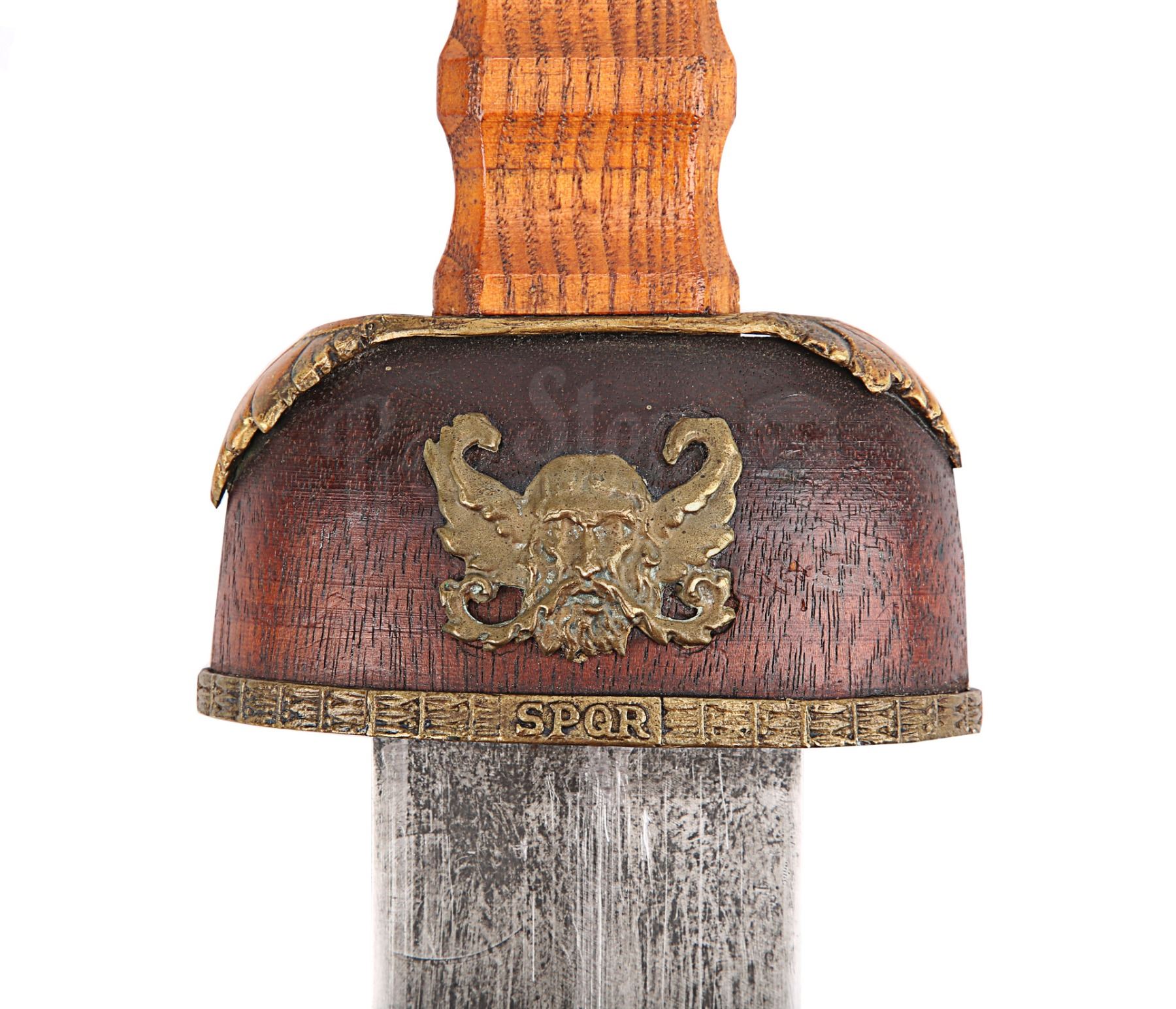 A hero officer’s sword and scabbard from Ridley Scott’s historical epic Gladiator. Officers wore their swords on their hips during the opening battle against the Barbarian tribes in the forests of Germania.