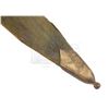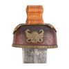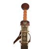 The sword is made of aluminium, with a wooden hilt decorated with brass leaves and a face. The sheath is made predominantly of wood, with a green suede cover, brass adornments and a leather cross strap, allowing it to hang at the wearer's hip. The blade has been intentionally tarnished to look time-worn, and there is some additional wear from production use and age, including scuffing and scratches. The suede on the sheath is discoloured and peeling in patches, and also features some glue residue. Dimensions: 82 cm x 9.5 cm x 6 cm (32 1/4" x 3 3/4" x 2 1/4")