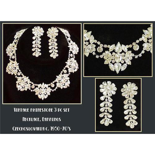 A GLAMOROUS piece reminiscent of "OLD HOLLYWOOD"!!! Dazzling, glittering vintage necklace, prong set with sparkly rhinestones. MINT condition, rhinestones are glittering with no fogginess. It is extremely difficult to capture the beauty, which eye so easily perceives, picture just doesn't do the justice to this exquisite piece. The necklace/choker is approximately 14" -14-1/2" long and 1-3/8" wide. Pictured earrings are NOT part of this Auction, but listed separately ($95). Acquired (1991) in Czechoslovakia from the sample room of now defunct costume jewelry maker. This company produced high quality jewelry for big names; this one was from a sample room section marked DIOR. The set was never worn and made during 1950-70's era. Please note that for Ebay Live Auctions only bids at or over $300.00 will be successful and meet our reserve.