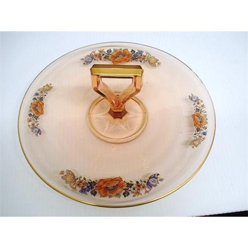 GLAMOROUS PINK CRYSTAL LARGE ROUND SERVING SWEETMEAT - CAKE PLATTER WITH LOVELY POST-HANDLE AND ADORNED WITH FLORAL DESIGN - as per images - IT STANDS ABOUT ABOUT 5 INCH TALl AND 10 3/4 inch in diam., EXCELLENT CONDITION, NO CRACKS OR CHIPS, US Buyer please remit 9.00 for shipping plus insurance.THANKS.