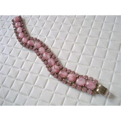 GLAMOROUS VINTAGE BRACELET, MADE FROM BEAUTIFUL SATIN PINK COLOR COBOCHON RHINESTONES AND SQUARE TINY RHINESTONES - as per images,It has quite an unusual combination of stones in appearance and shape and all of them prong set,Not marked, Excellent condition ? The clasp is functioning well, all stones are present and there are no chips or cracks,Please study the images as they are part of description.Measures about 7 inch long, US Buyer please remit 7.00 for shipping plus insurance.THANKS.