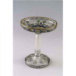 GLASFACHSCHULE HAIDA/ STEINSCHÖNAU, Adolf Beckert Fußschale, farbloses Glas mit farbiger Bemalung eines floralen Dekors in Grün, Blau, Gelb, Gold und Schwarz. Über rundem Tellerfuß mit Facettenschliff ein ebenfalls facettierter Fuß mit Entasis, darauf eine flache Schale. H.: 16 cm. Unbezeichnet. Um 1915-20 Lit.: Das Böhmische Glas, 1700-1950, Bestandskat. Passauer Glasmuseum, Bd. IV: Jugendstil in Böhmen, Tittling 1995, S. 241-244. (Zum Dekor)