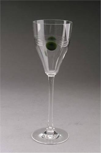 Jean Beck<BR> Weinglas,<BR> farbloses Glas, auf der Kuppa vier grün-gelbe, runde Aufschmelzungen, darüber drei umlaufende, geschnittene Wellenbänder. H.: 21,5 cm. Unbezeichnet. Um 1908<BR> Lit.: Warthorst, Karl W., Gebrauchsglas 1, 1898 - 1924, Freiburg 2001, Abb. S. 15 (Formvariante)<BR>