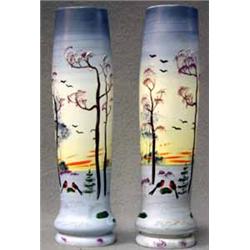 1 PAR VASER, FLUSSGLAS, MÅLAD DEKOR AV FÅGLAR I VINTERLANDSKAP, H39