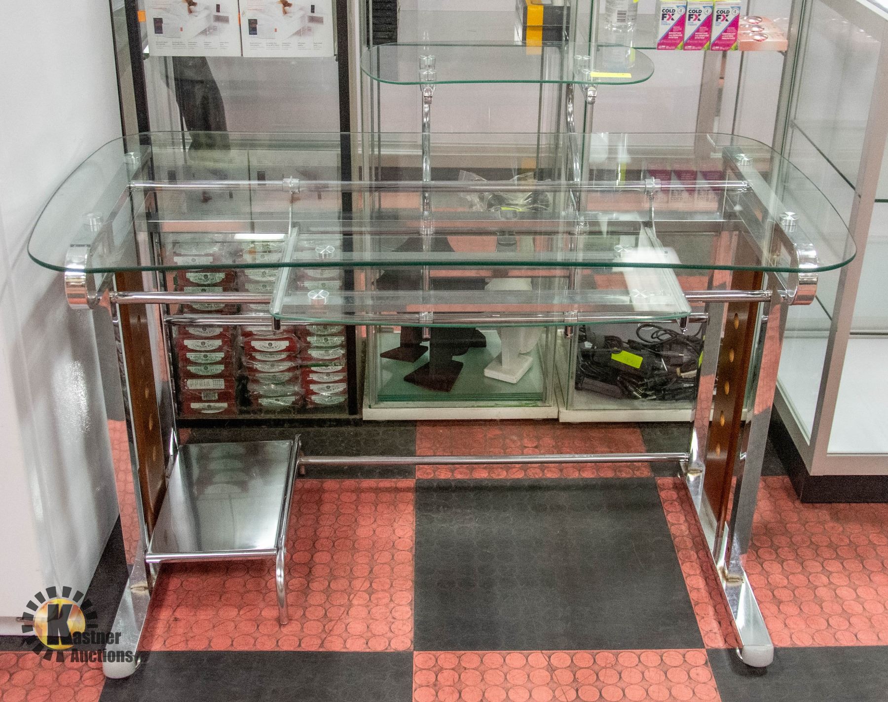 KEYBOARD SLIDES TO EITHER SIDE, GLASS MONITOR PEDESTAL SLIDES SIDE-TO-SIDE, ADJUSTABLE LEVELING FEET (47.25"L X 28"W X 28.25"-DESKTOP HEIGHT) **ALL ITEMS MUST BE REMOVED BY 5PM SATURDAY, NOVEMBER 18TH 2023. ALL REMAINING ITEMS WILL BE SUBJECT TO A $6.00 PER DAY STORAGE CHARGE. ANY ITEMS REMAINING AFTER MONDAY, DECEMBER 4TH, 2023 WILL BE CONSIDERED FORFEITED. NO REFUNDS WILL BE ISSUED FOR FORFEITED ITEMS. TO SCHEDULE A PICK UP APPOINTMENT CLICK HERE