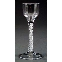 GLASS - An English cordial glass An English cordial glass, with ogee shaped bowl, the stem with opaque white gauze surrounded by a pair of opaque white spiral threads, spreading circular foot, 5.75in high, c.1760