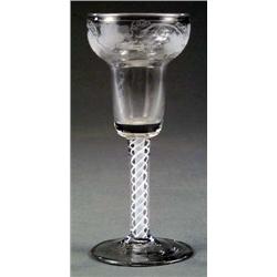GLASS - An English wine glass An English wine glass, with double ogee bucket bowl engraved with fruiting vine, the stem with opaque central gauze surrounded by four opaque white spiral threads, spreading circular foot, 6.25in high, c.1760 (some chipping to footrim)