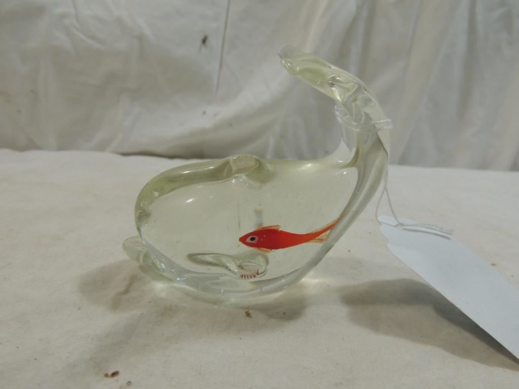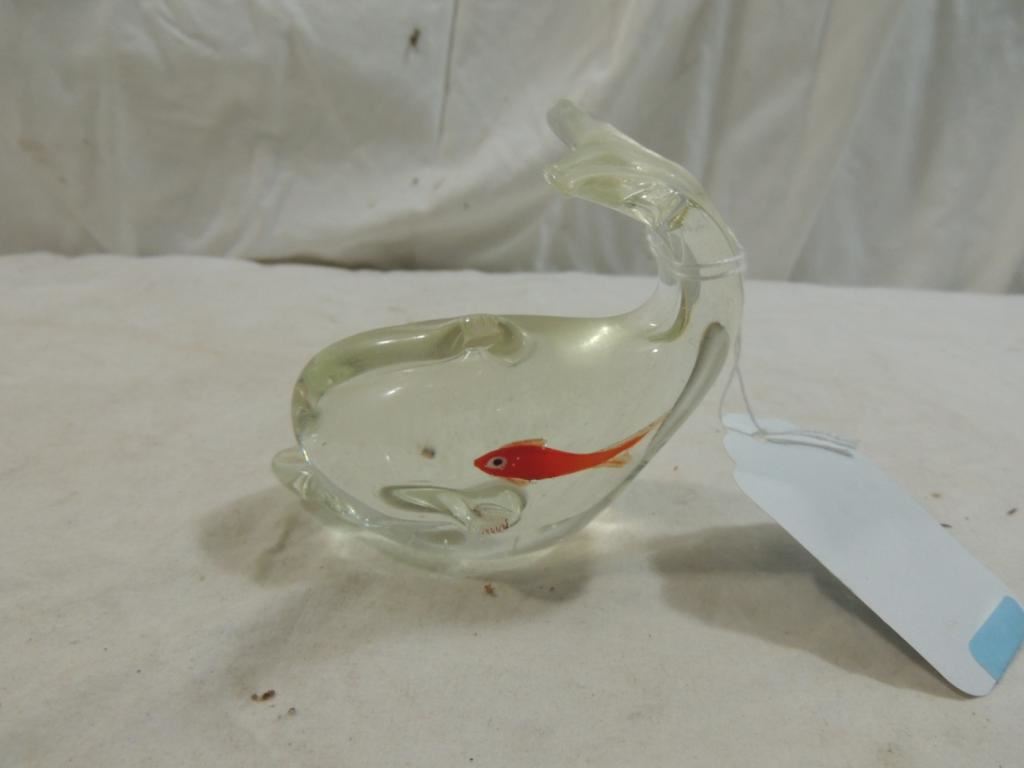 GLASS BLOWN FISH PAPERWEIGHT WITH LITTLE FISH INSIDE, DECORATIVE PAPERWEIGHT, AS SHOWN SEE PHOTO FOR MORE DETAILS.