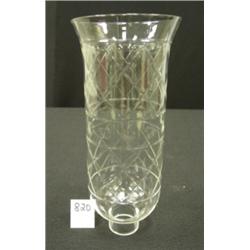 Glass chimney cut with diamond panels and central thumbprint pattern band. Rim is flared. Narrowed base has 1.25" opening. 10.75" tall. Condition: Excellent