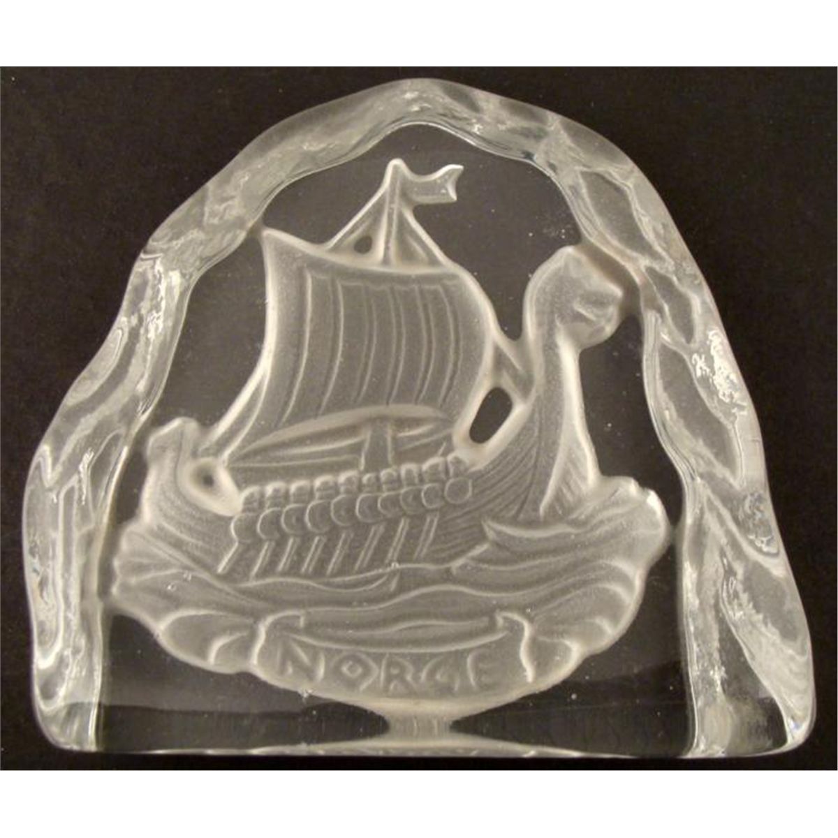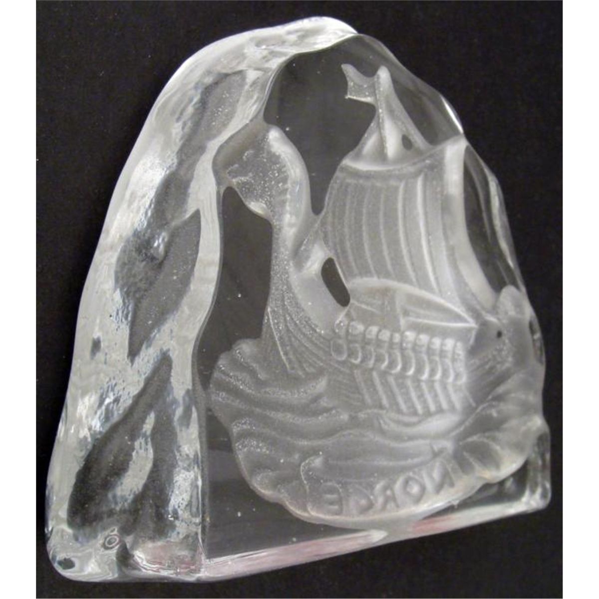 GLASS DESK ORNAMENT WITH TALL SHIP "NORGE" CARVED/FROSTED FROM BACKSIDE * BEAUTIFUL PIECE 3 1/2 X 3 1/2" *