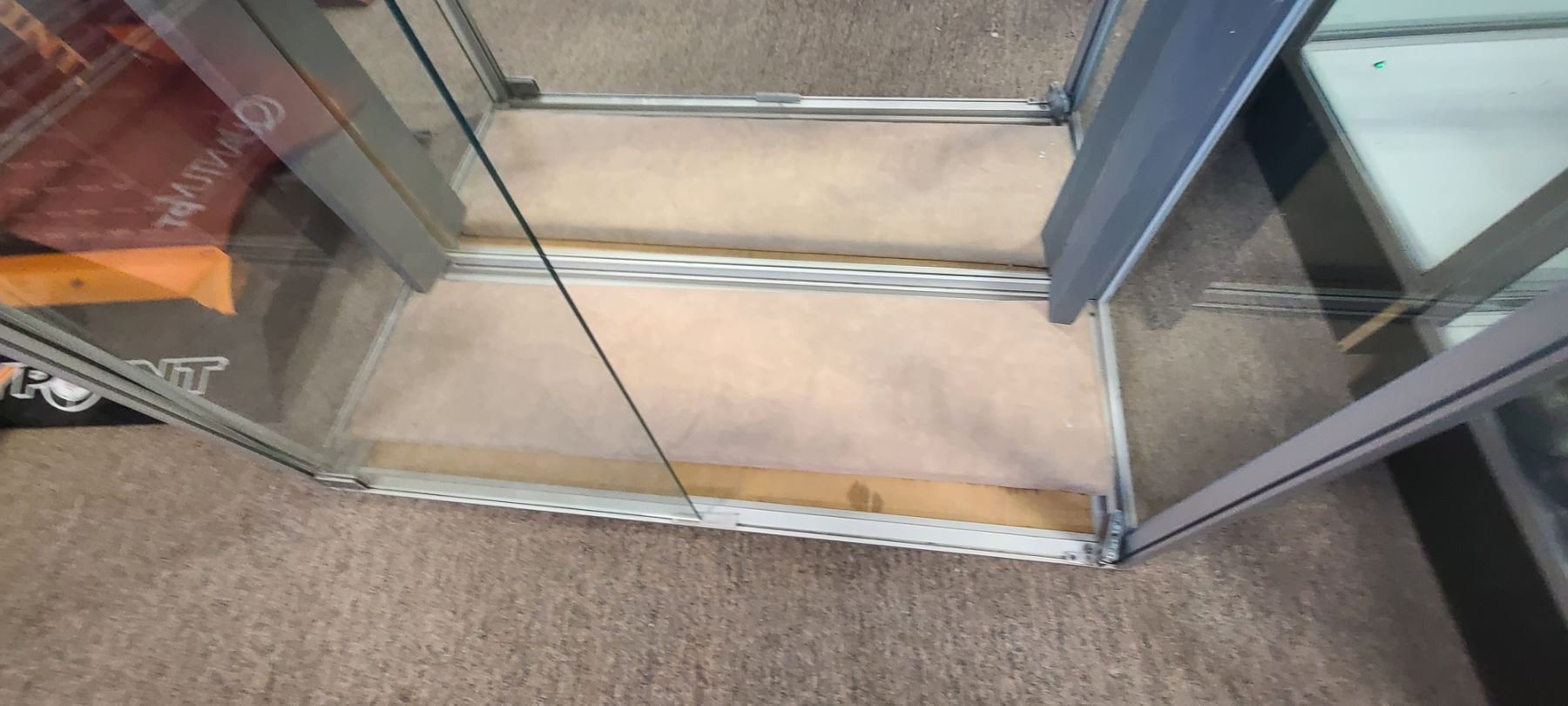 GLASS DISPLAY CASE ONE DOOR MISSING - ONE HANGING SHELF 6' X 4' X 18"