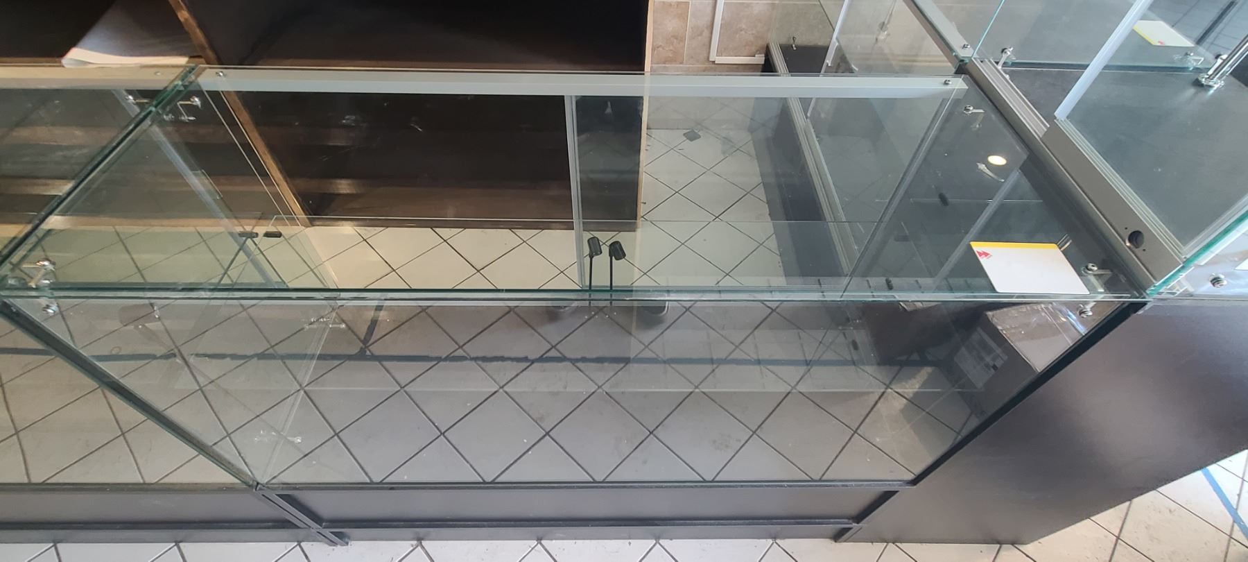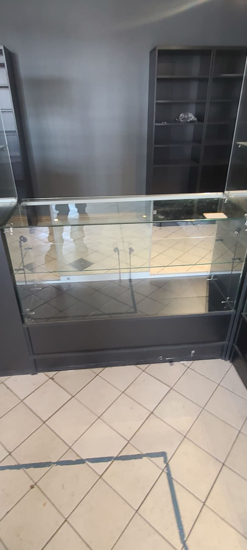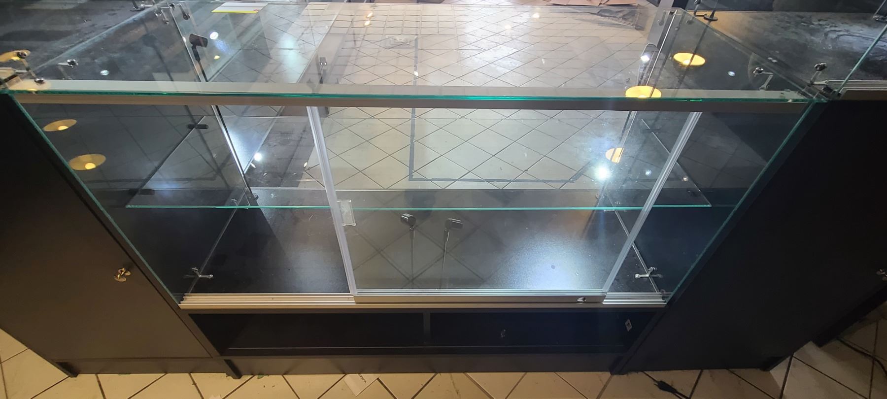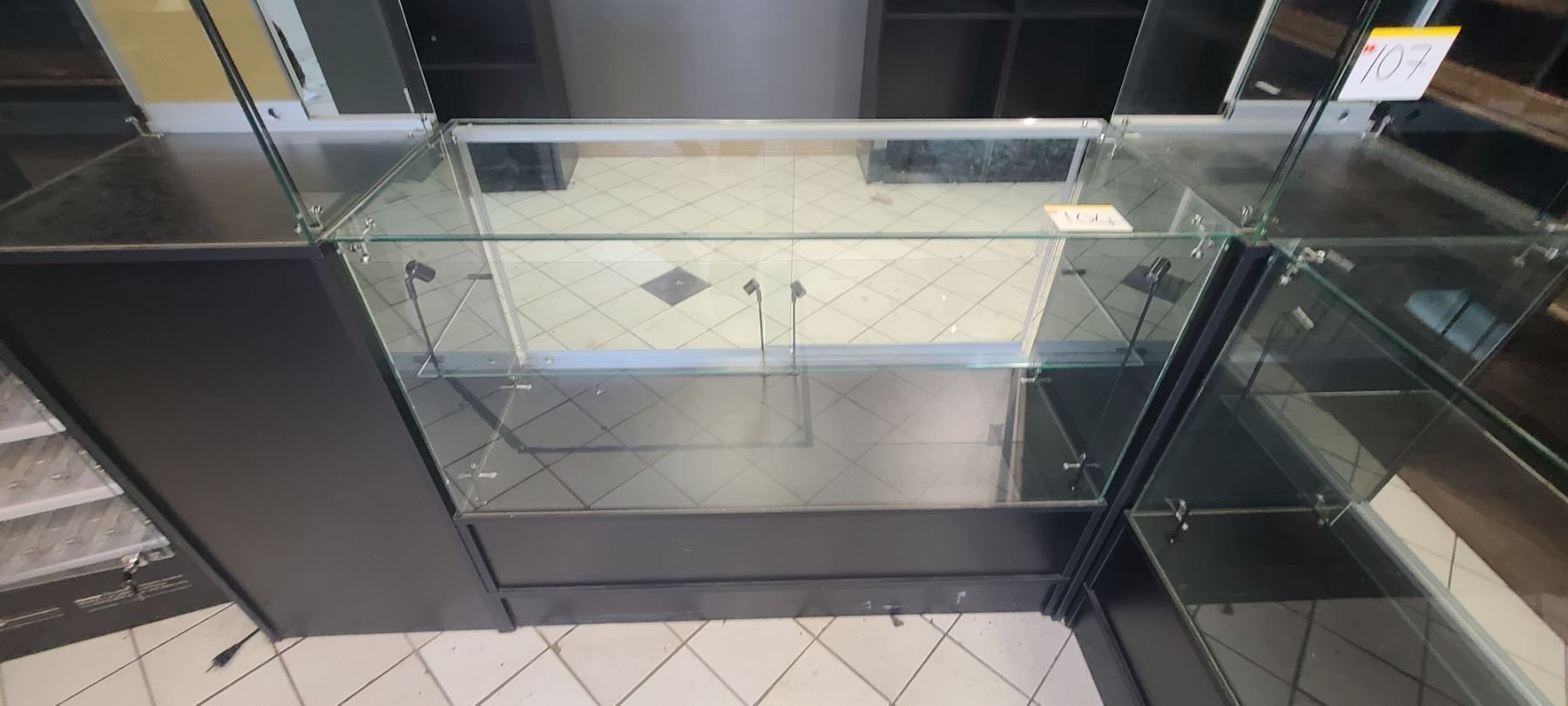 GLASS DISPLAY CASE WITH FOUR INTERNAL LIGHTS SIZE LENGTH 48" X HEIGHT 38" X WIDTH 18" ITEM HAS SLIDING GLASS DOORS AND UNDERNEATH STORAGE(PLEASE NOTE THAT IT IS ONLY ONE DISPLAY CASE) LOCATED IN ST. ALBERT