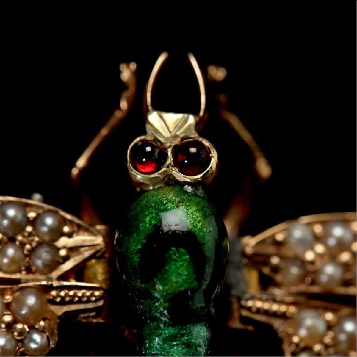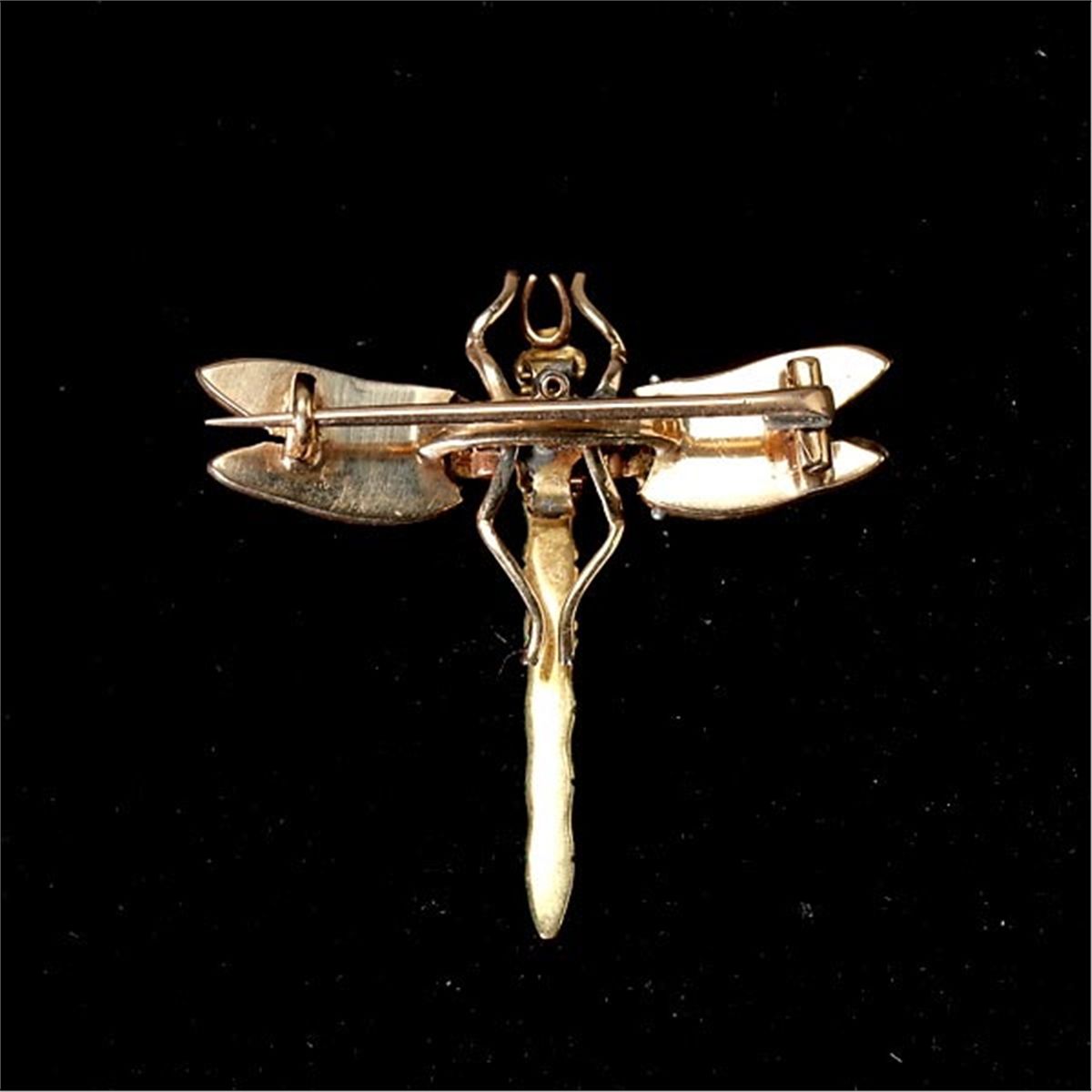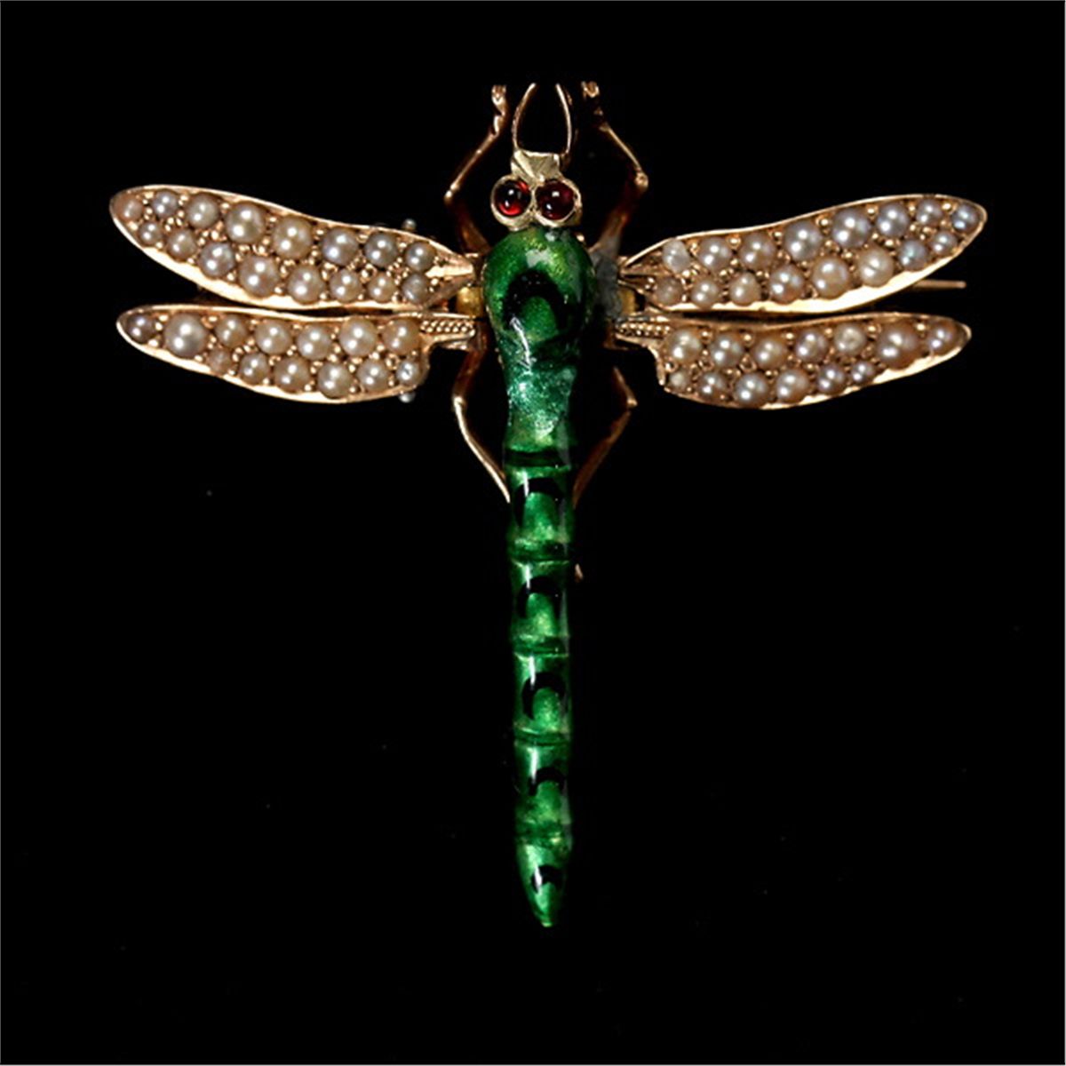 GLASS, ENAMEL, PEARL, 14K YELLOW GOLD DRAGONFLY BROOCH. Designed as a dragonfly, its wings inset with numerous half pearls, the body accented by green and black enamel, featuring glass eyes set in a 14k yellow gold mounting, completed by a pin stem and catch. 4.50 dwts